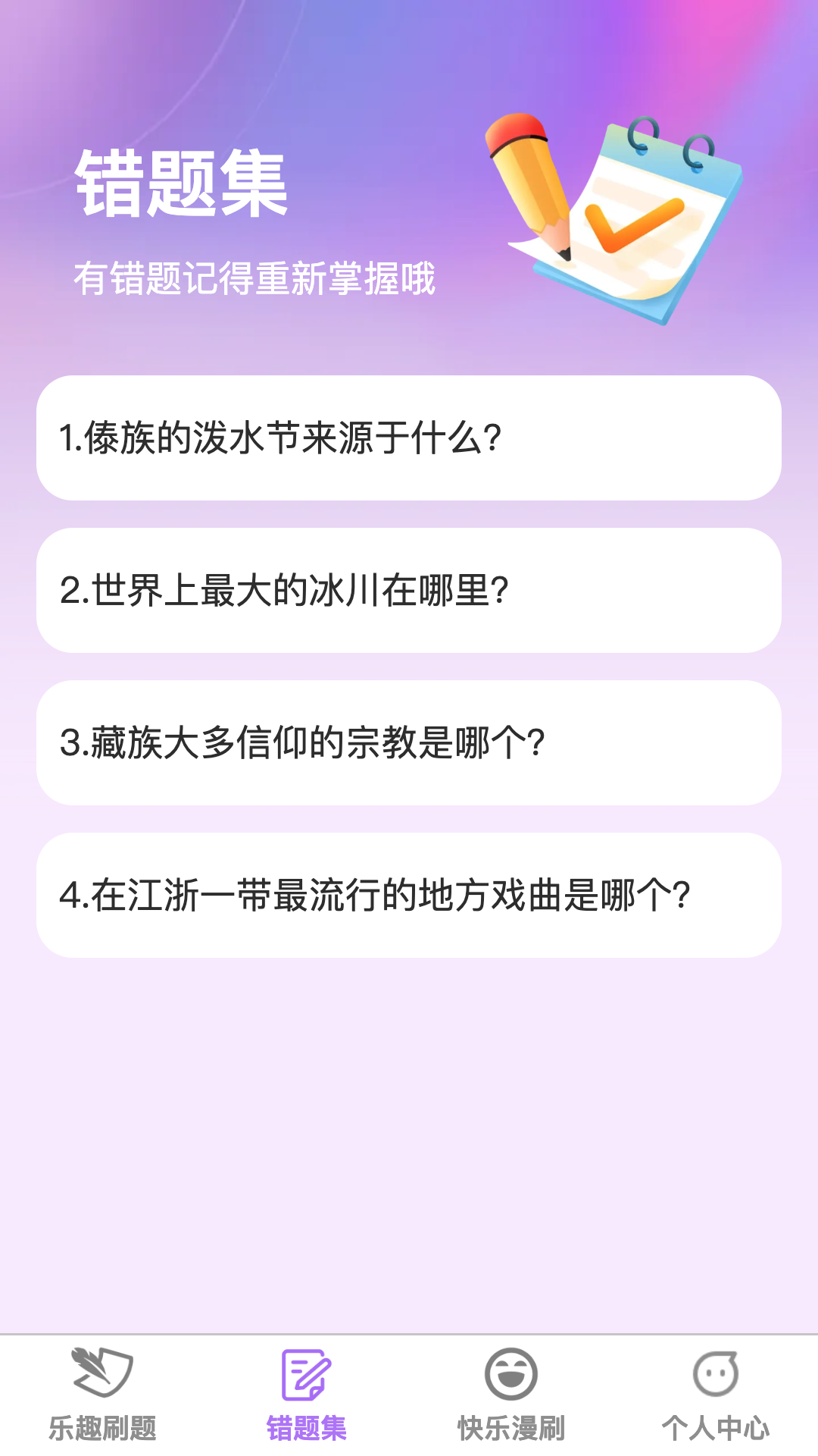 【乐趣刷题】在乐趣刷题模块中,您可以找到多种科目的学习题库,涵盖多种学科,并通过趣味性强的问题激发学习兴趣。每道题目都经过精心设计,帮助您在轻松愉快的环境中提高学习效果。