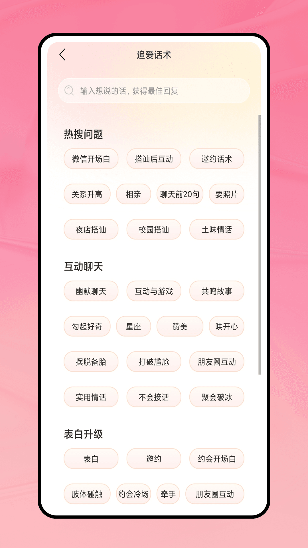拥有成千上万的可搜索恋爱聊天助手情话的聊天话术库,讨人喜欢的聊天套路与聊天模板,持续更新。如果没有话题以及遇到不懂的聊天,只需打开我们就可复制回答轻松搞定啦!