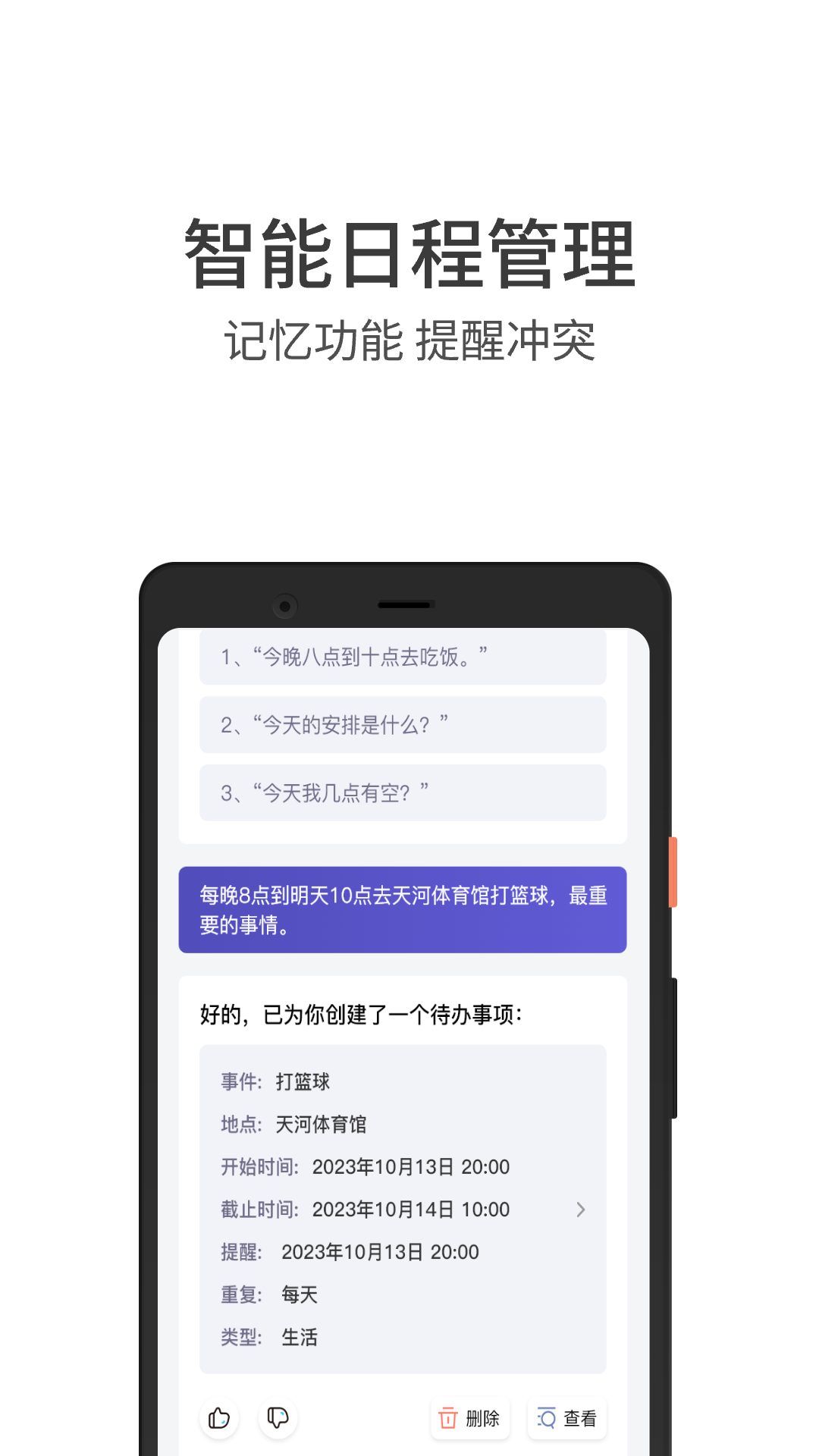 在日程管理方面,言秘书有着出色的表现。您只需说出要做的事情,它就能帮您进行记录并提醒您,而且它还具备检测日程冲突的功能哦!