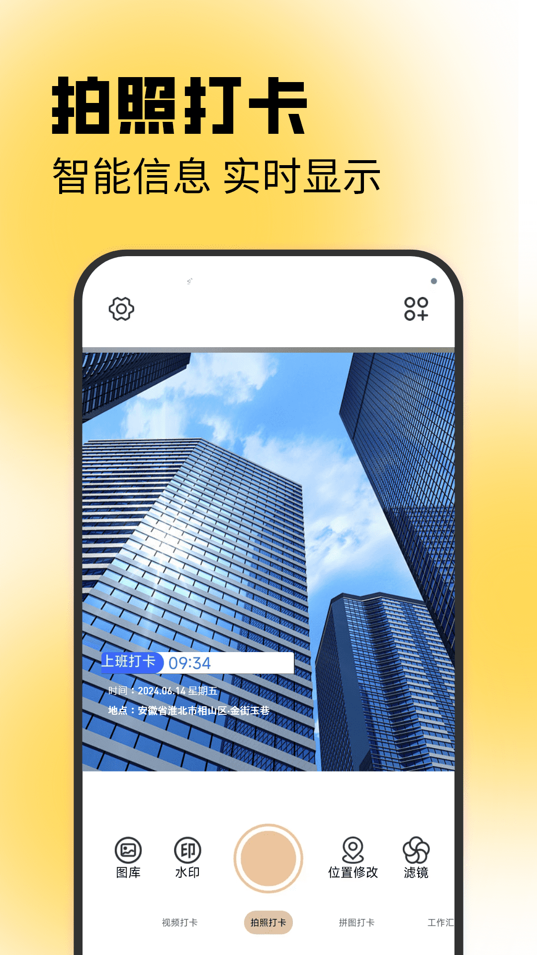相机多种打卡专属水印模板,对标北京时间,位置准确,轻松打卡,记录即刻工作与生活,相机水印时间、定位实时更新,自动更新。