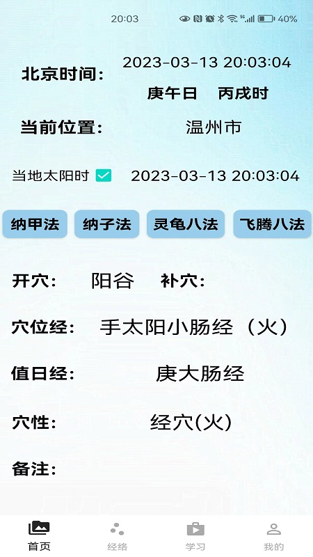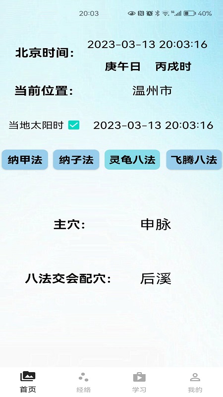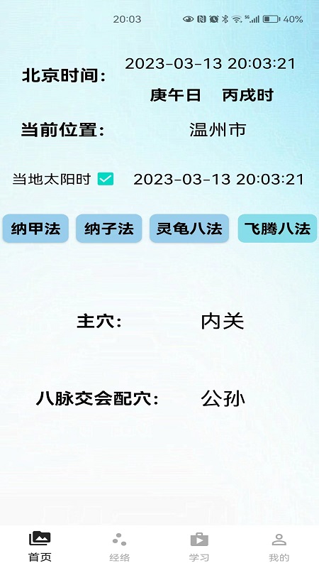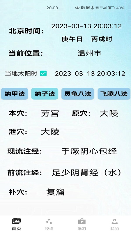 软件包含“首页”、“经络”、“学习”、“我的”四个版块。其中软件的首页也是最核心的部分。主要用来展示子午流注的相关内容,包括纳甲法、纳子法、灵龟八法和飞腾八法四项内容。