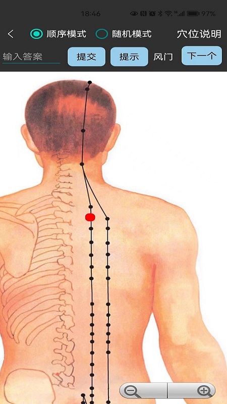 第二页为“经络”版块,主要是十四经络的国标图片,方便大家查看。此处图片的查看和退出均采用左右划动的方式。提供一些细致经络、穴位的查询、搜索功能以及练习功能帮助大家更好的记忆人体穴位。