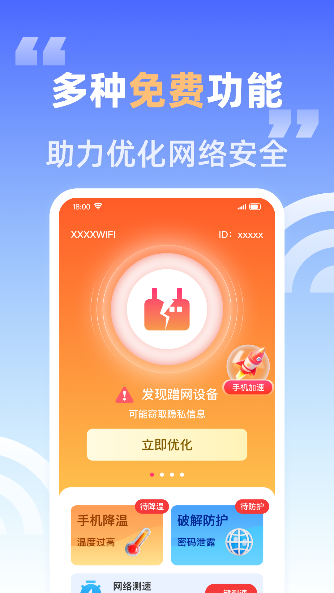 1、一键加速:智能识别并优化您的网络连接,享受飞一般的上网速度。告别卡顿,流畅体验从万网WiFi钥匙开始。