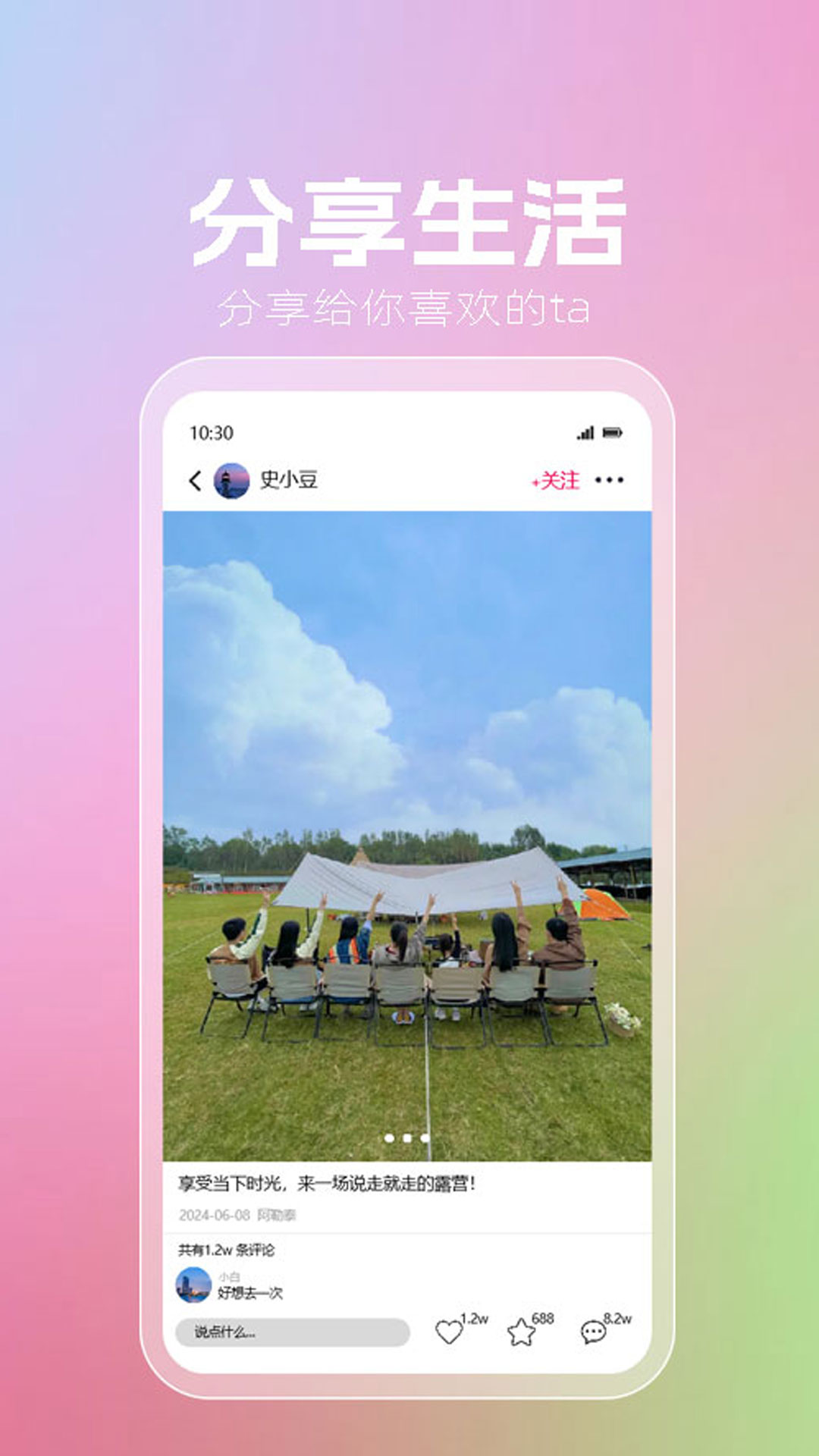 【社交功能】用户群体从职场白领到孕妈宝妈,更有年轻大学生在平台上分享精彩内容。用户可以通过点赞、评论、分享、关注等方式进行互动。