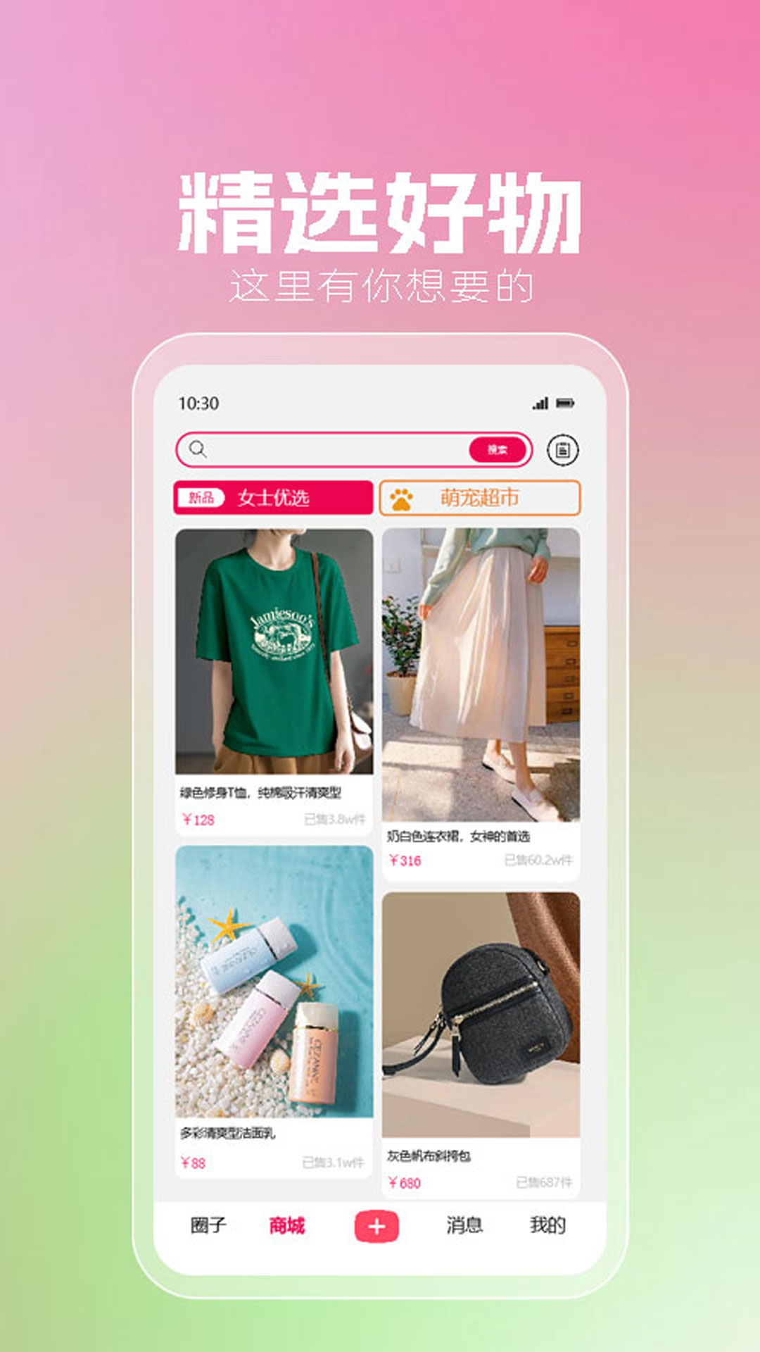 你可以发布生活动态和朋友们分享精彩生活,同时平台也提供了女士优选产品及萌宠消费品。美出圈作为社交