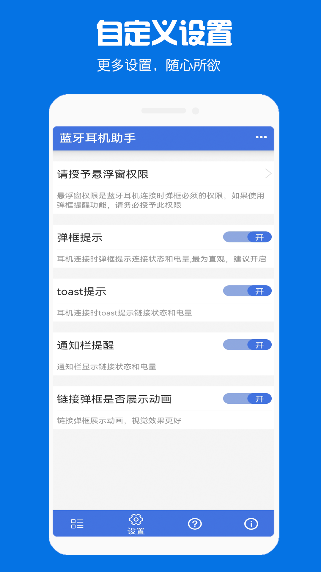 1. 在蓝牙耳机连接的时候,支持弹框、toast、通知栏等多种提示方式。