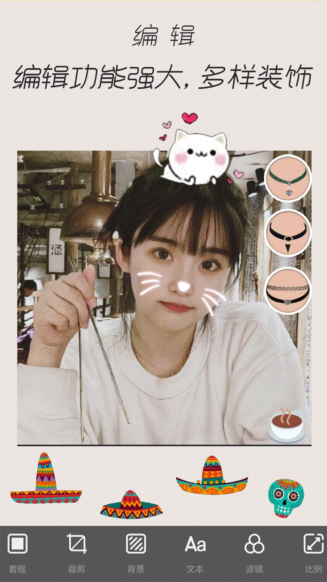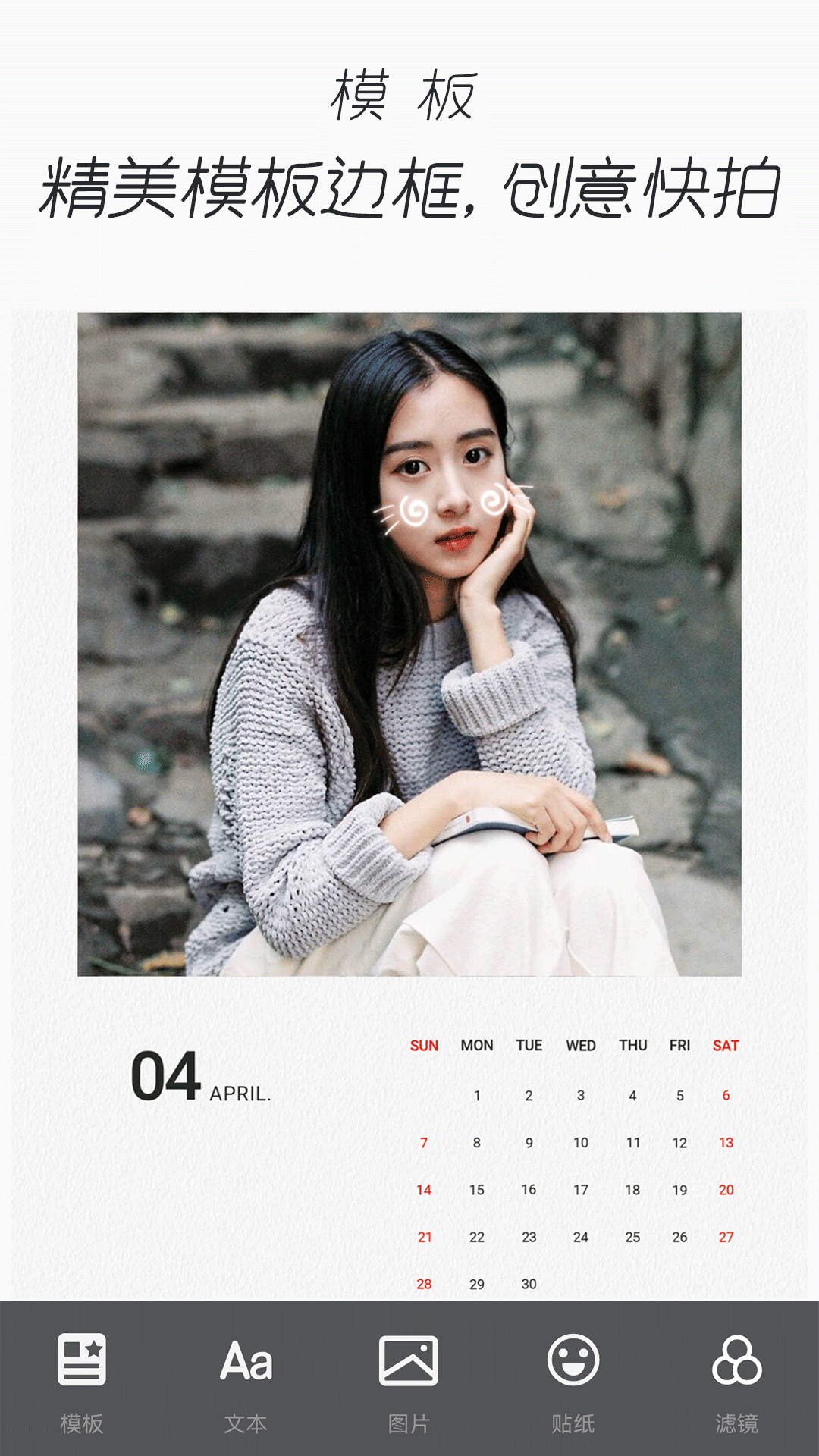 其二,照片装饰丰富多样,包括边框、背景、贴纸、文本、马赛克、镜像、涂鸦等多种方式。