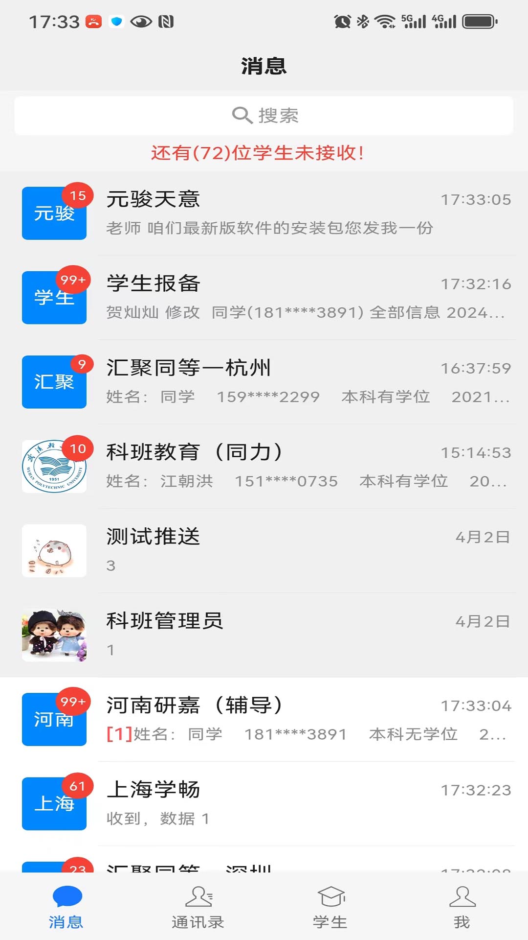 主要功能学生数据维护,数据推送,跟进,实时消息提醒。