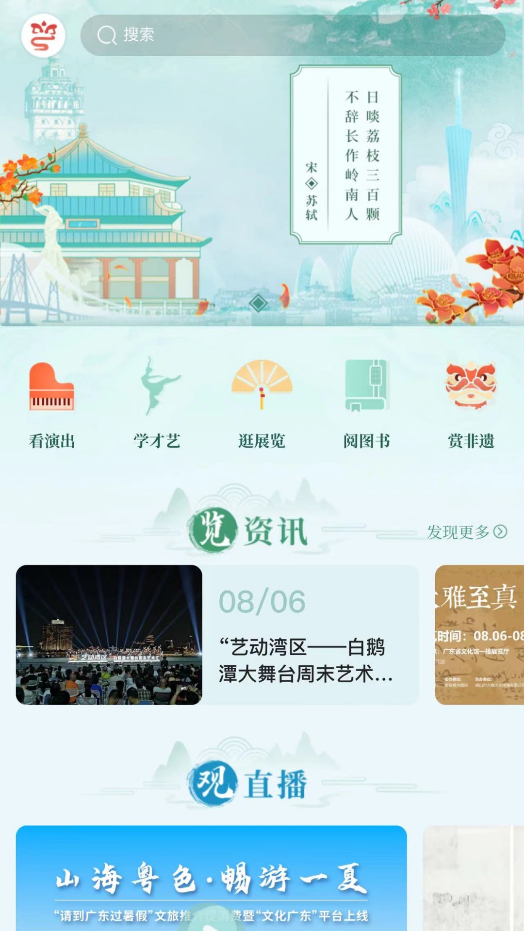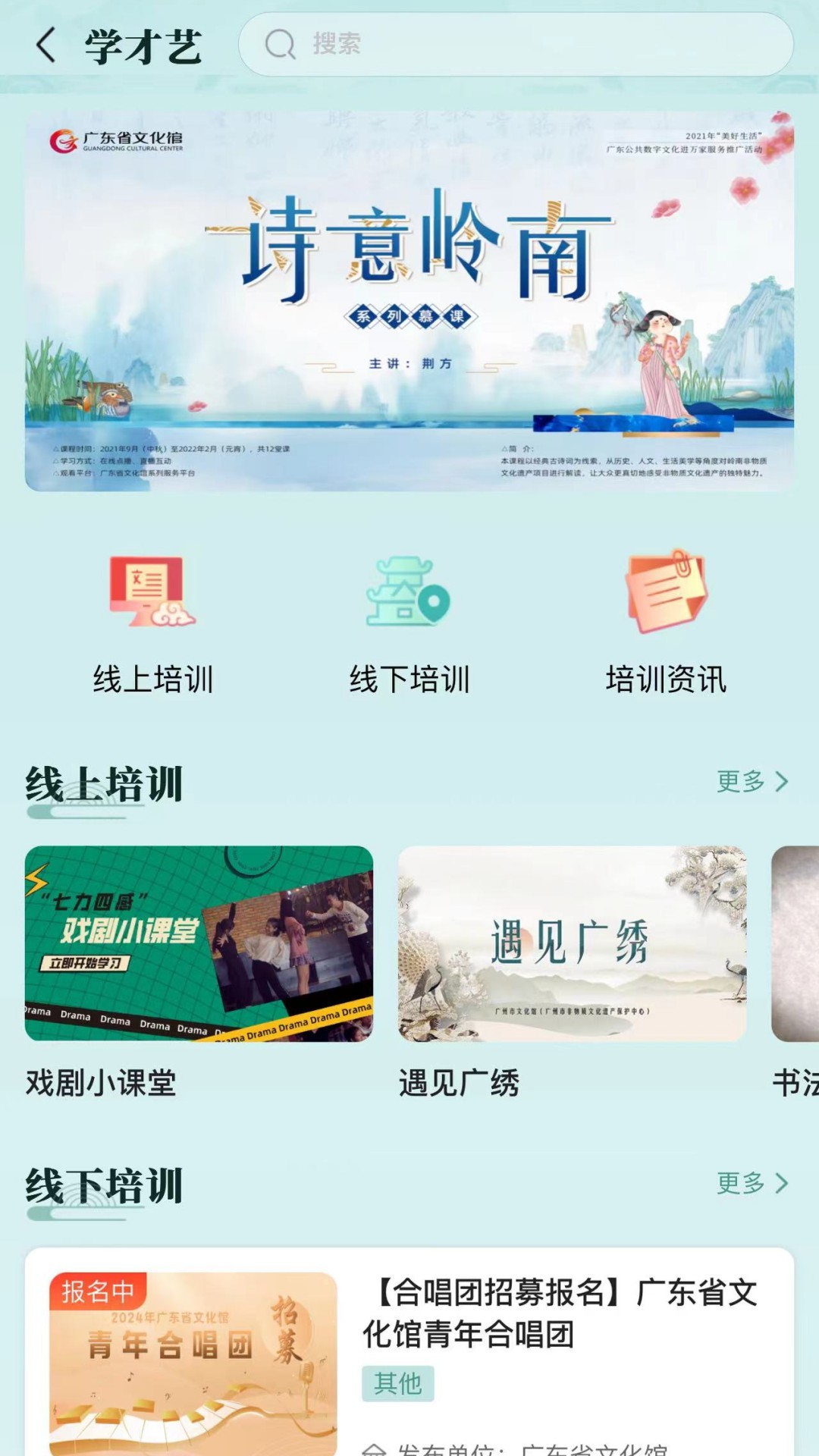 省文化和旅游厅公共服务平台的数字文化移动端——文化广东APP,具备多种功能,像看演出、学才艺、逛展览、观直播、阅图书、赏非遗、订场馆等应有尽有,能够让您一站式体验公共文化服务。