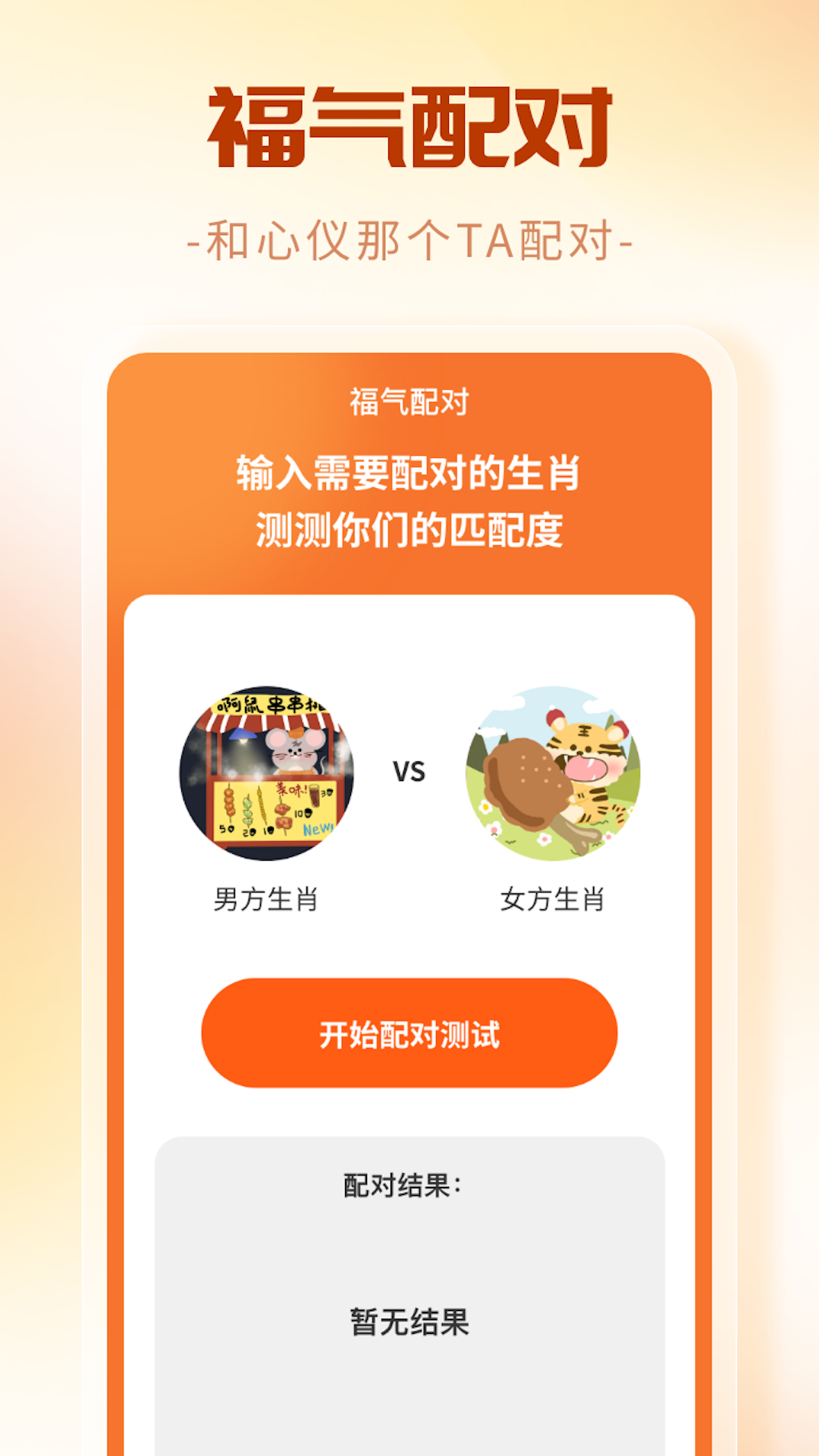 【福气配对】在这里可以测试人与人之间的生肖配对度。