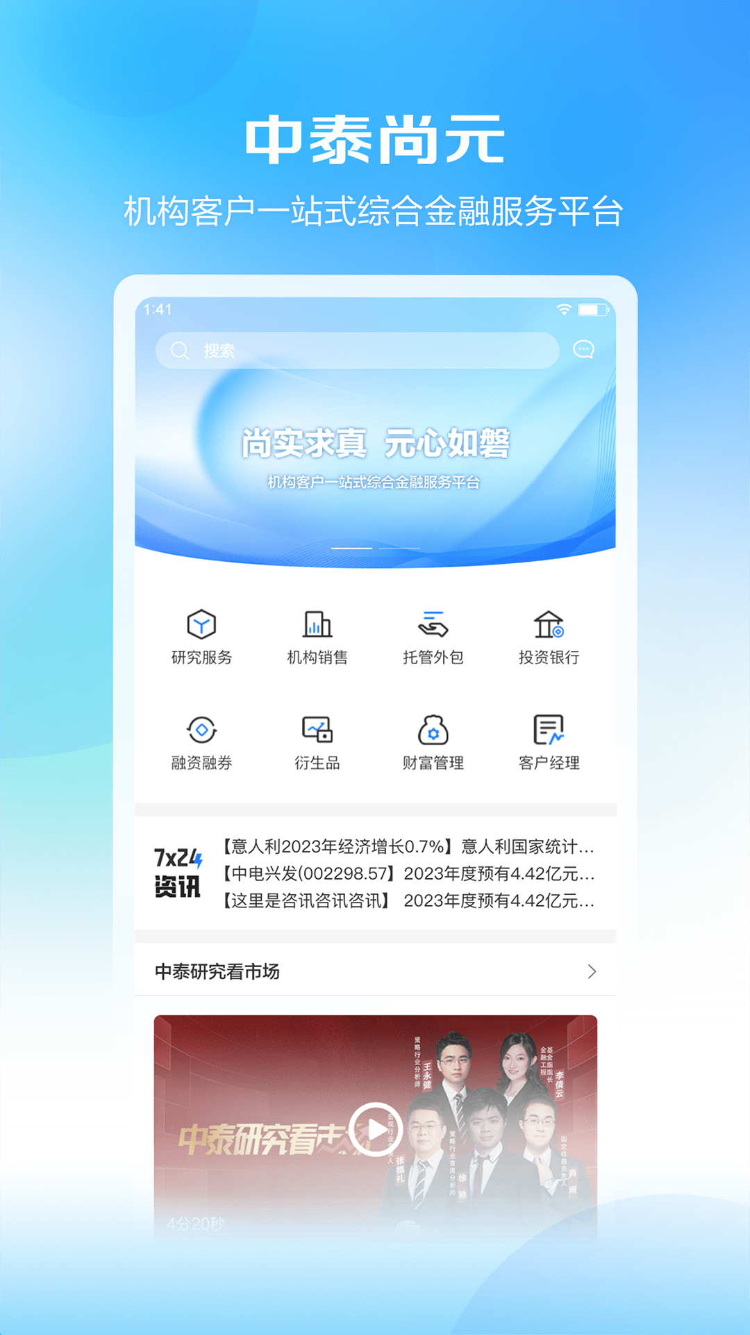 中泰尚元是中泰证券专为机构客户精心打造的一站式综合金融服务平台。该平台面向金融机构客户提供七大类型的服务,包括研究服务、机构销售、托管外包、投资银行、融资融券、衍生品以及财富管理。机构客户能够在线获取最新的业务资讯,进行业务沟通,完成数据查询,办理活动申请等常规操作。
