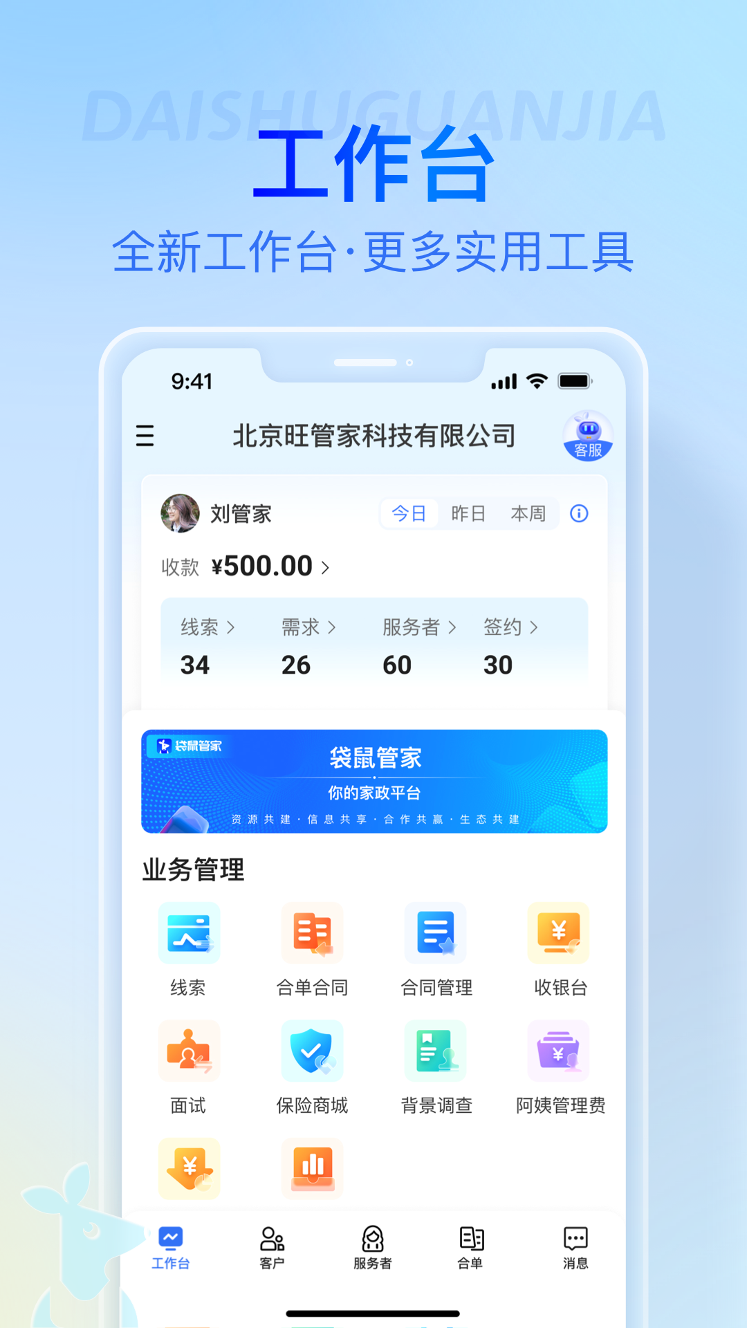 袋鼠管家平台隶属于北京袋鼠管家科技有限公司,总部位于北京。平台秉持“免费入驻”的宗旨,遵循“终身受益、先到先得、平等透明”的合作原则,联合行业内的优秀企业,致力于推动家政服务朝着标准化、职业化、规模化方向发展,从而为中小企业赋予能量。平台与合作伙伴并肩前行,达成“资源共创、信息共享、合作共赢、生态共建”的目标,改善传统家政行业的现状,重塑家政行业的新生态。