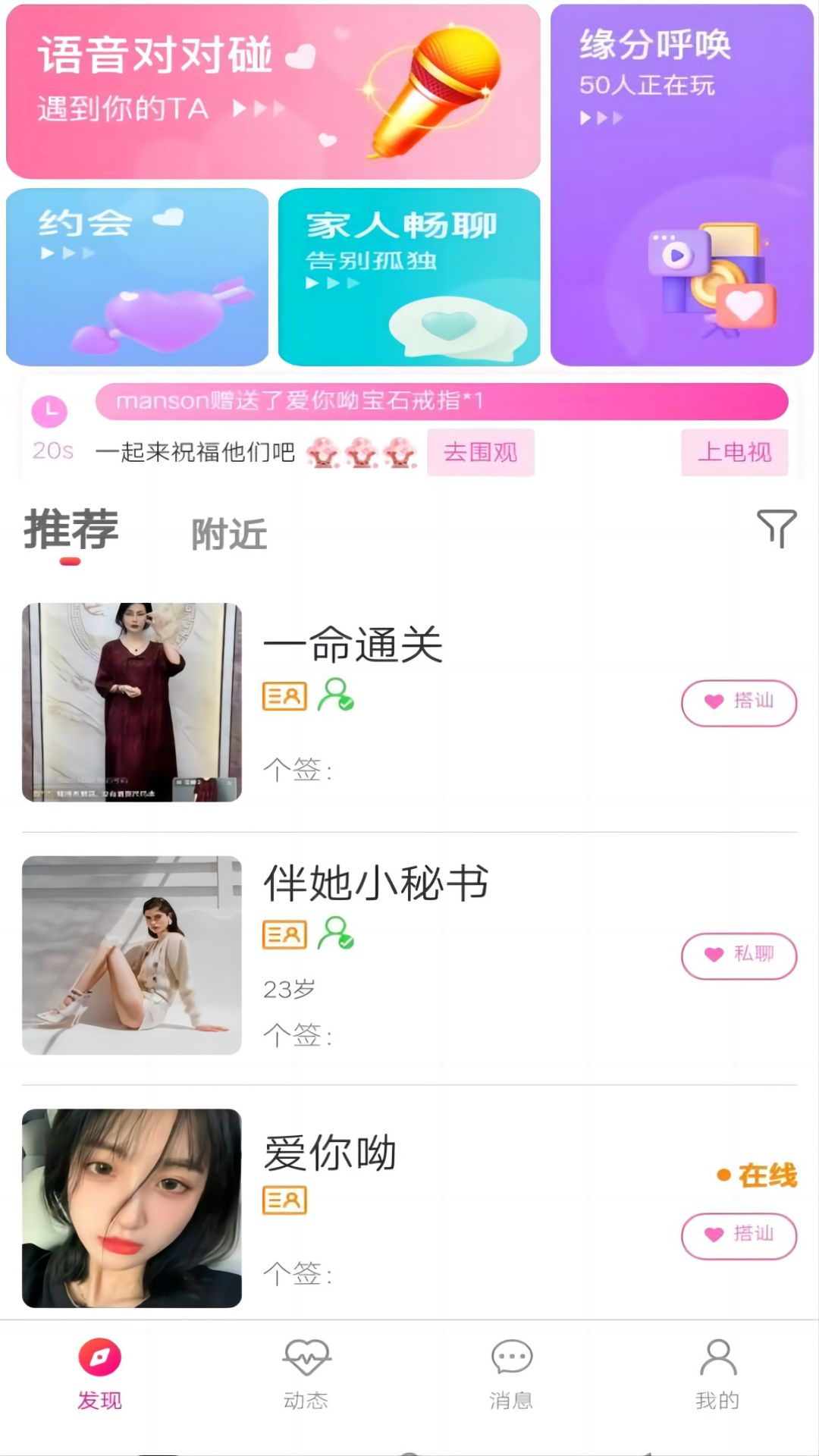 {缘分匹配} 依据您的兴趣喜好,快速为您推荐令您心动的类型,助力您更迅速地找到志趣相投之人。