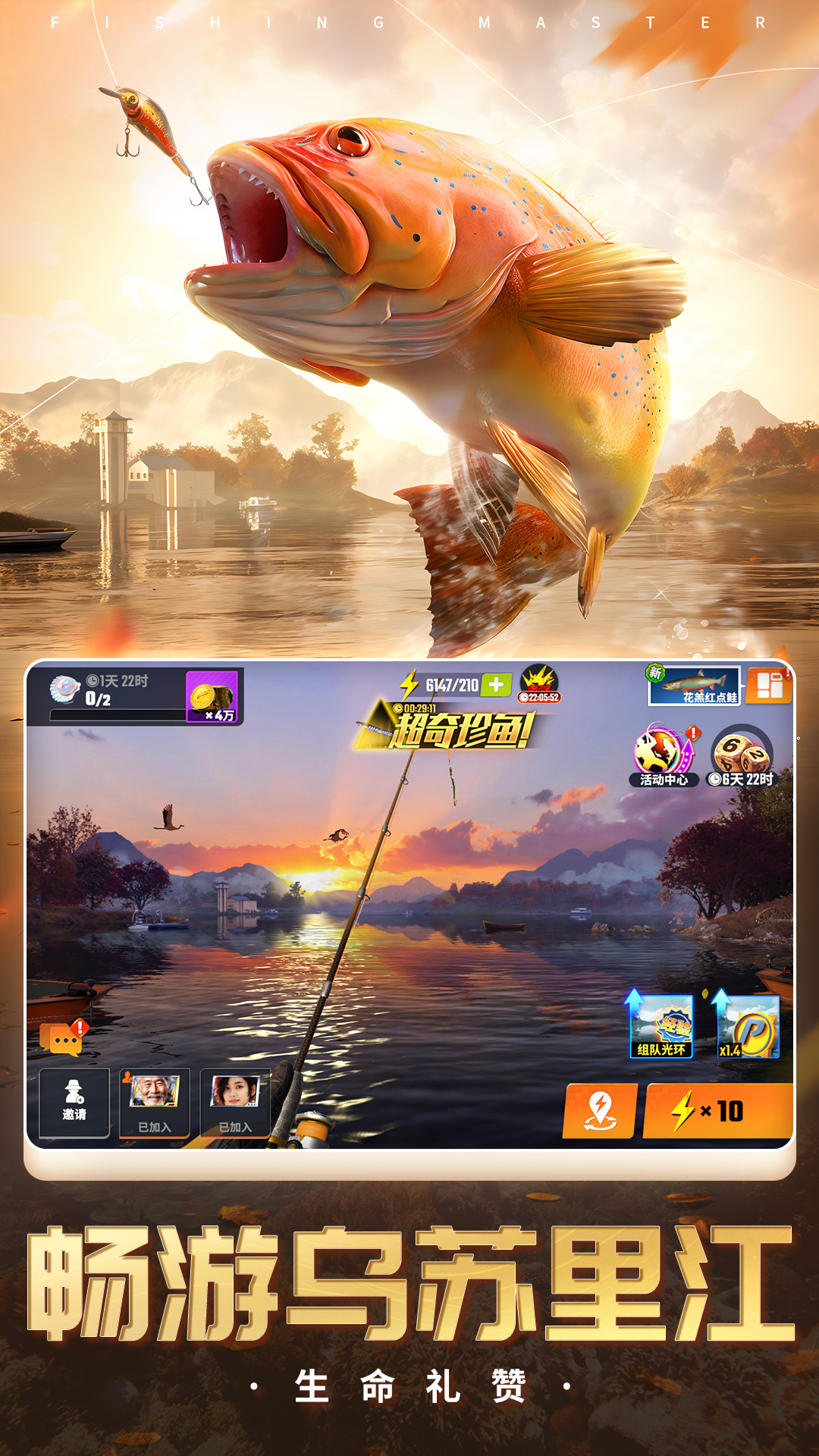 【新渔场】 赫哲渔火传千古,乌苏里江鱼满舱:T2等级淡水渔场乌苏里江开启 新增洄游鱼成就,点亮对应图册,获得惊喜奖励 【新活动】 一、鲑鱼溯洄唱响生命礼赞 活动时间:2024-9-27 8:00 到 2024-10-11 7:59 活动内容:等级达到15级的钓友,可进入渔场 活动奖励:集齐主题闪卡,即可获得限定鱼竿皮肤福禄宝杖 二、七日签到得主题套装 七日黄金周,登录游戏签到,得限定棒球主题套装 【新功能】 一、多人同屏钓鱼功能震撼上线 活动渔场新增多人模式,等级达到17级后,点击多人模式即可开启 二、新增渔场等级显示 新增渔场等级显示,渔场等级变化增加动画展示与按钮展示 渔场升级,增加休闲模式与挑战模式 【缤纷活动】 一、欢乐跳跳跳 活动时间:2024-9-27 8:00 到 2024-10-4 7:59 二、沙滩寻宝 活动时间:2024-10-4 8:00 到 2024-10-11 7:59 三、金色传说 活动时间:2024-9-27 8:00 到 2024-10-4 7:59 四、钓王争霸赛 活动时间:2024-10-4 8:00 到 2024-10-11 7:59