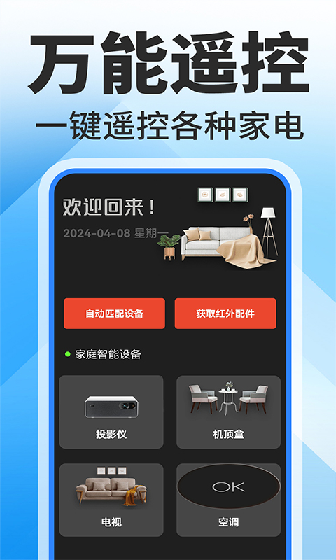 【空调电视多种电器都能用】它内置多种遥控功能,无论是空调、电视,还是投影仪等产品,都能被这个软件轻松遥控,这意味着你使用一个软件就可以轻松控制家中众多电器啦。