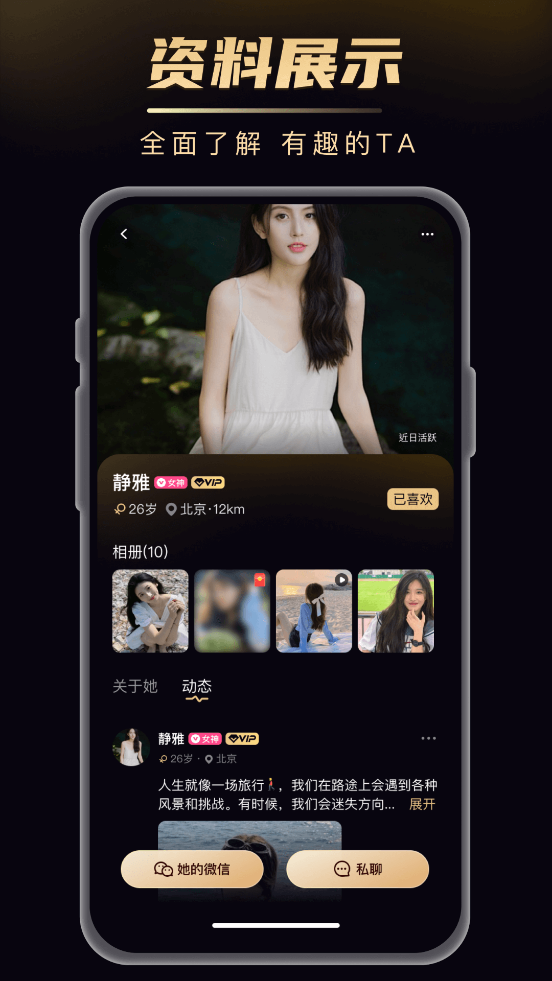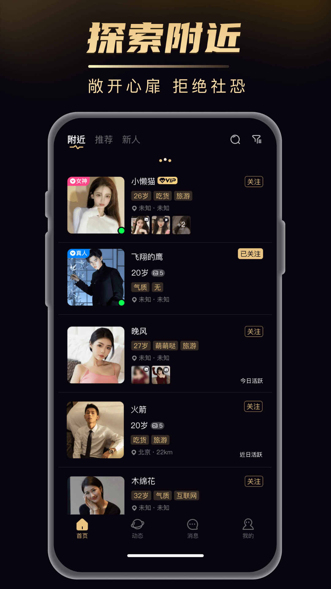探缘是一个同城的可靠交友平台。在这个平台上,用户能够发现自己感兴趣的异性,并且可以主动发起聊天互动。同时,它能帮助用户迅速定位到附近的人,从而开展个性化的约会活动,像是一起吃饭、唱歌、聚会或者打游戏等。