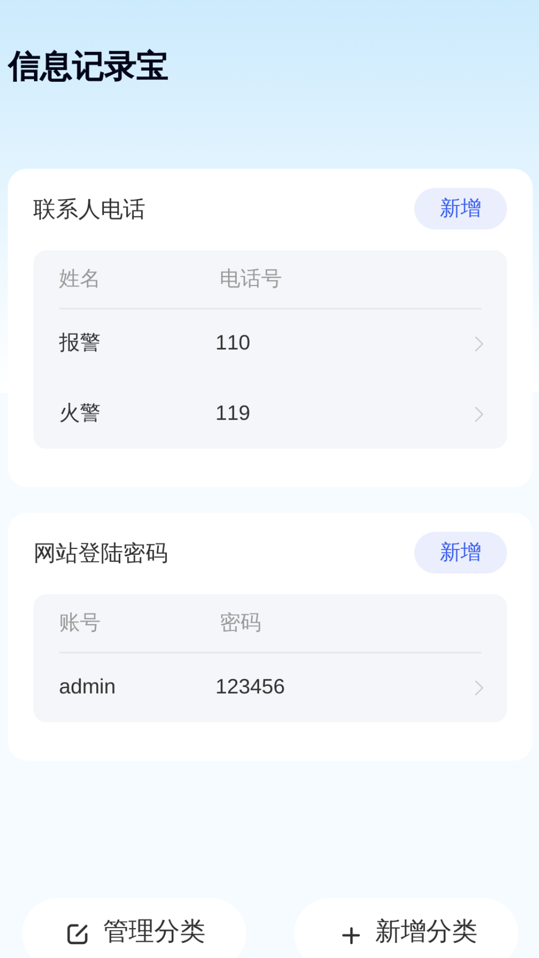 能够安全地记录重要联系人的电话以及网站登录的账号密码,实现集中化管理,方便查找,有效助力您保护个人信息安全。