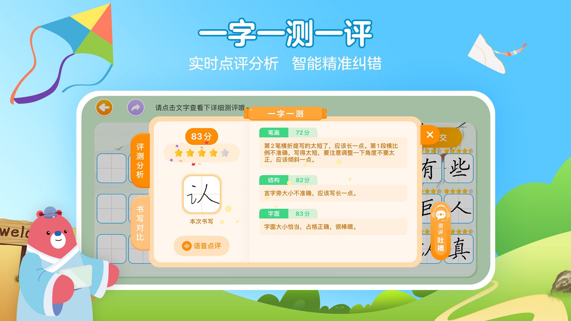 【一字一测一评】针对每一次的写字练习,只要拍照就能实时得到点评分析,智能且精准地纠错。