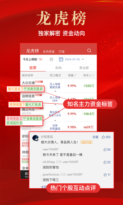 【实时龙虎榜】实时监控大单主力资金的流入和流出情况,采用顶尖的计算方式,就如同让您在盘中就能窥视龙虎榜一样,轻松掌握资金的强弱情况。
