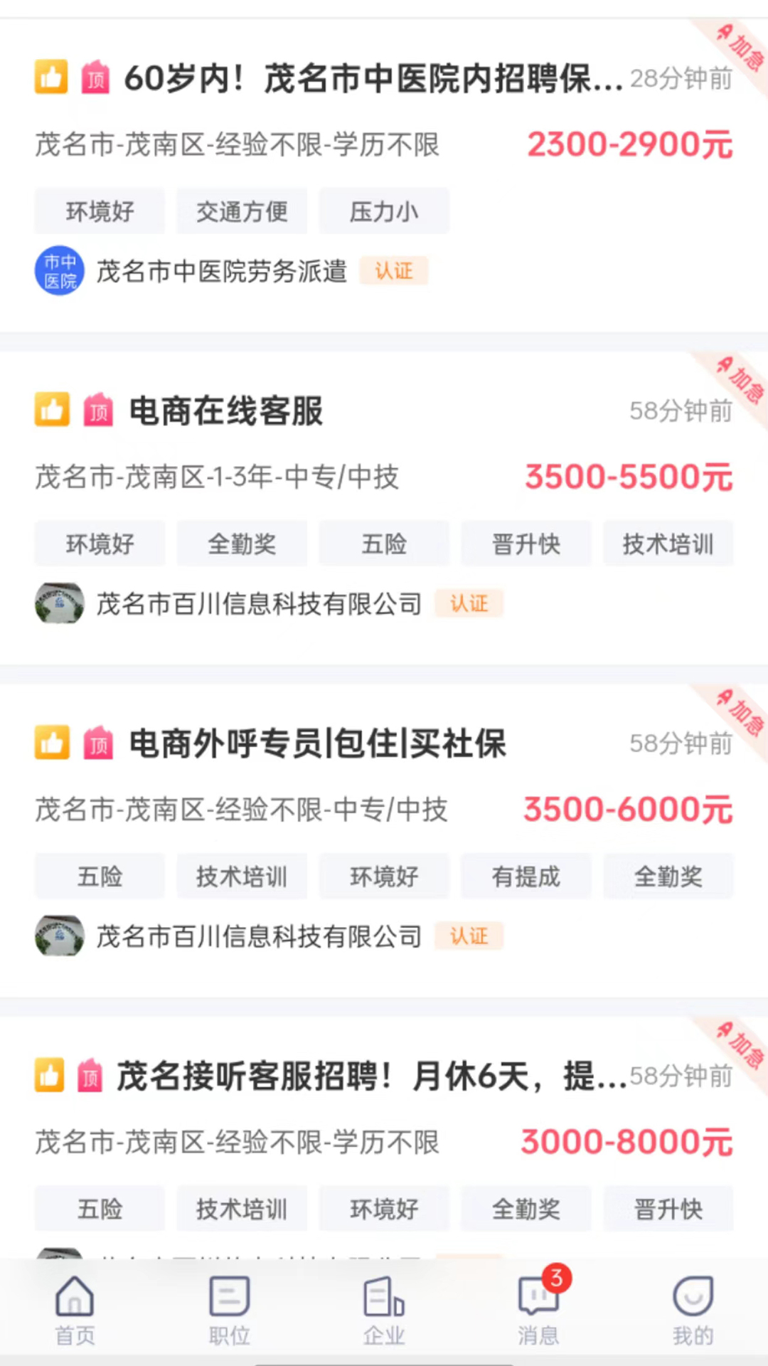 茂名人才网(www.mycjob.com),这里有求职招聘找工作的APP哦。它的服务覆盖茂名的三县两区,也就是茂南区、电白区、高州、化州和信宜。