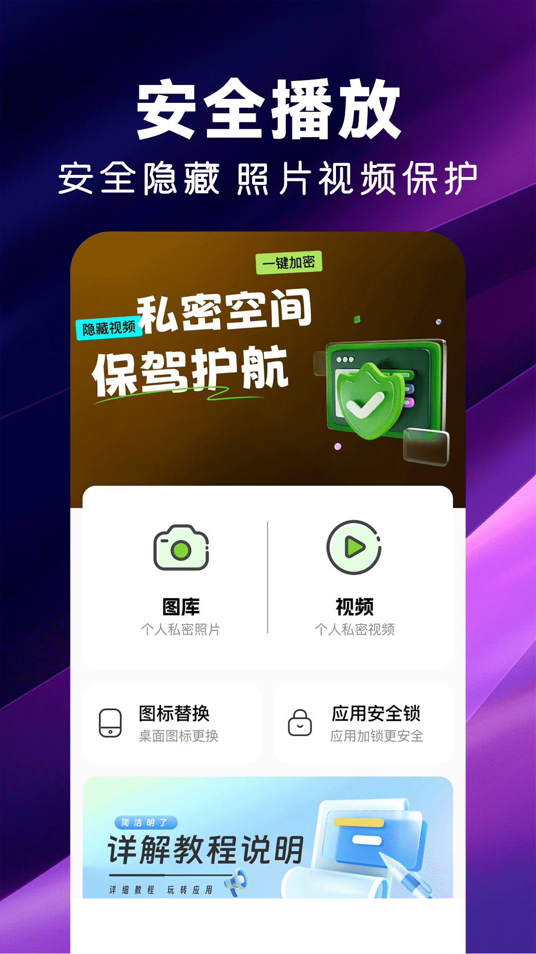 隐藏视频和图片的功能。用户可以将不希望被他人看到的视频或图片隐藏起来,这些文件在普通文件管理器中将不会显示,只有在私人播放器中通过特定方式才能访问。