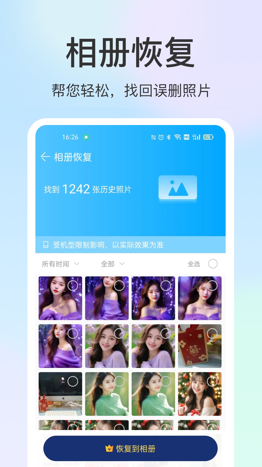 糖图相机运用先进的数据恢复技术,可以从手机里把您不小心删掉的照片找回来呢。操作特别容易,只要简单几步就能找回珍贵的记忆,简直就是您保护数据的好帮手。