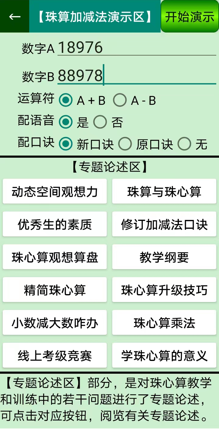 针对连续加减法听心算训练,软件在以标准语音播放算题时,实现了播音速度的无级调速。同时,软件还可通过语音、动画回放算题,从而对珠心算训练进行精准的指导。