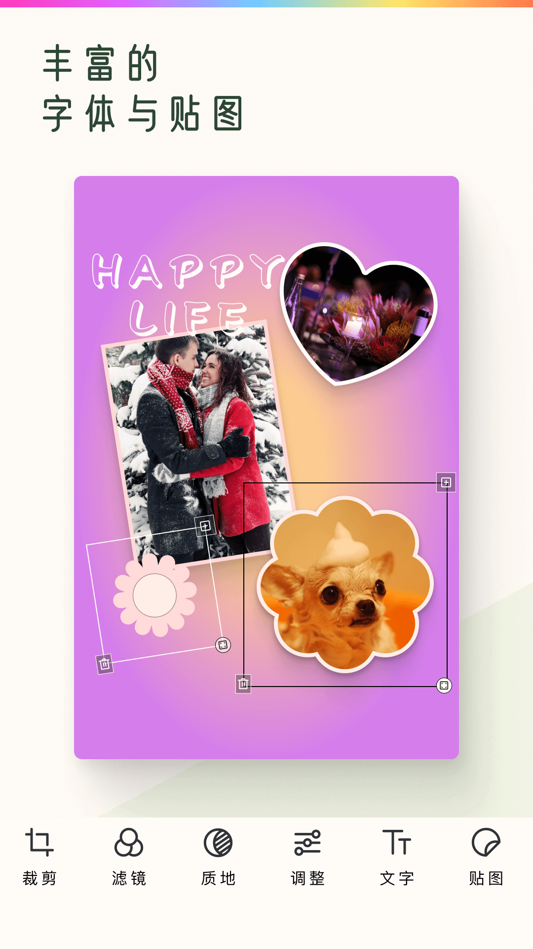 一款可以实现图片拼接、长图拼图、模板拼图、海报拼图、自由拼图等多种拼图样式的应用,并提供精美的滤镜特效、拼图模板以及背景、相框、贴图等素材,丰富的滤镜、拼图模板和素材均可免费使用,让您轻松有趣地创作出精美的图片拼图作品。