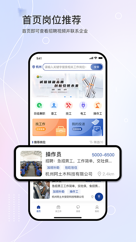 它采用“短视频+实时定位”的创新推送模式,一方面,能为用户推送包括普工、技工、日结工、兼职工等在内的多种能够达成“灵活用工”的企业职位;另一方面,向企业推送如高级技工、脱贫人员、防返贫人员、失业人员、普工人群等灵活用工人群。