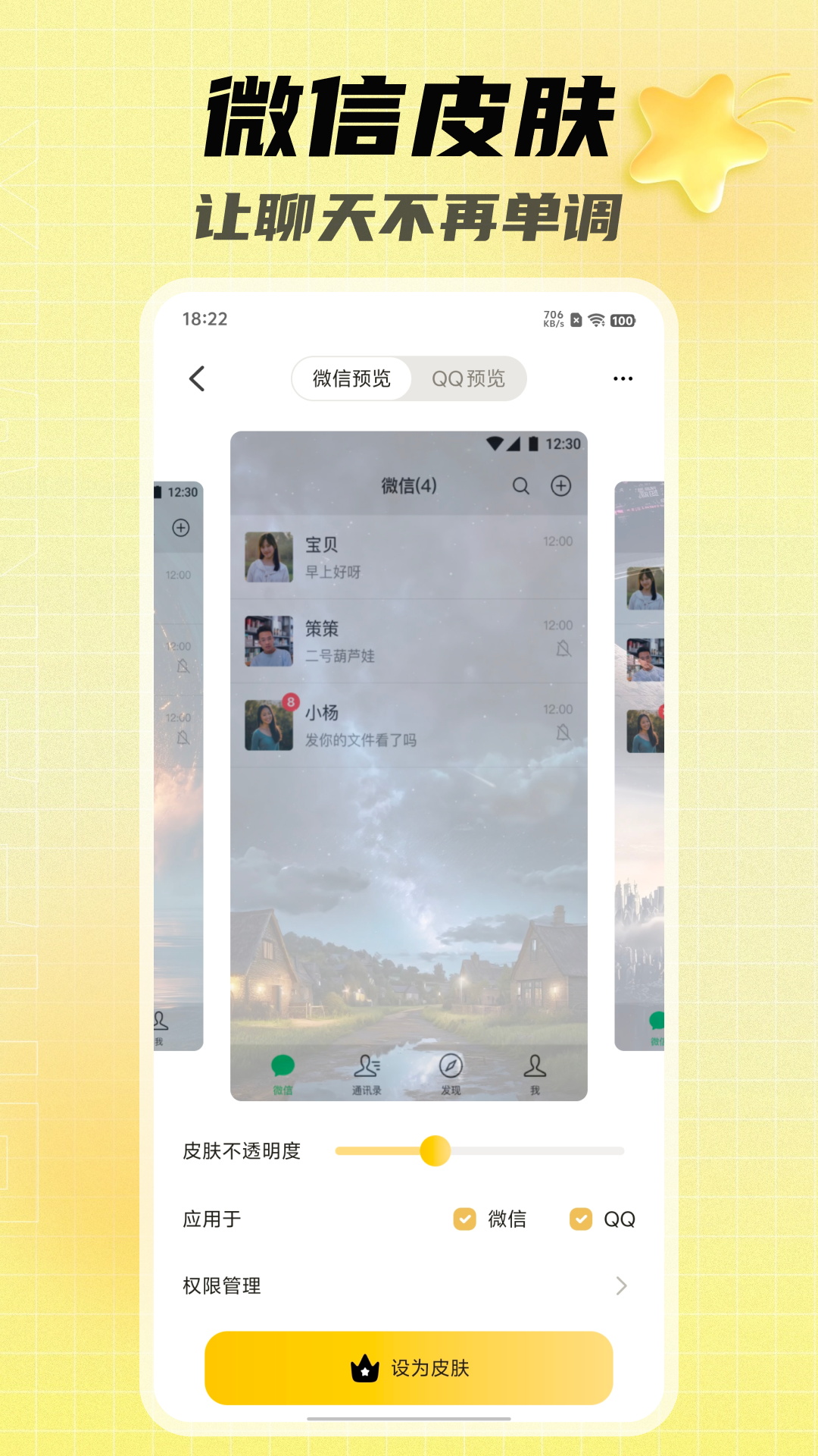 微信背景图随你选择,还支持相册自定义皮肤,定制专属自己的微信。