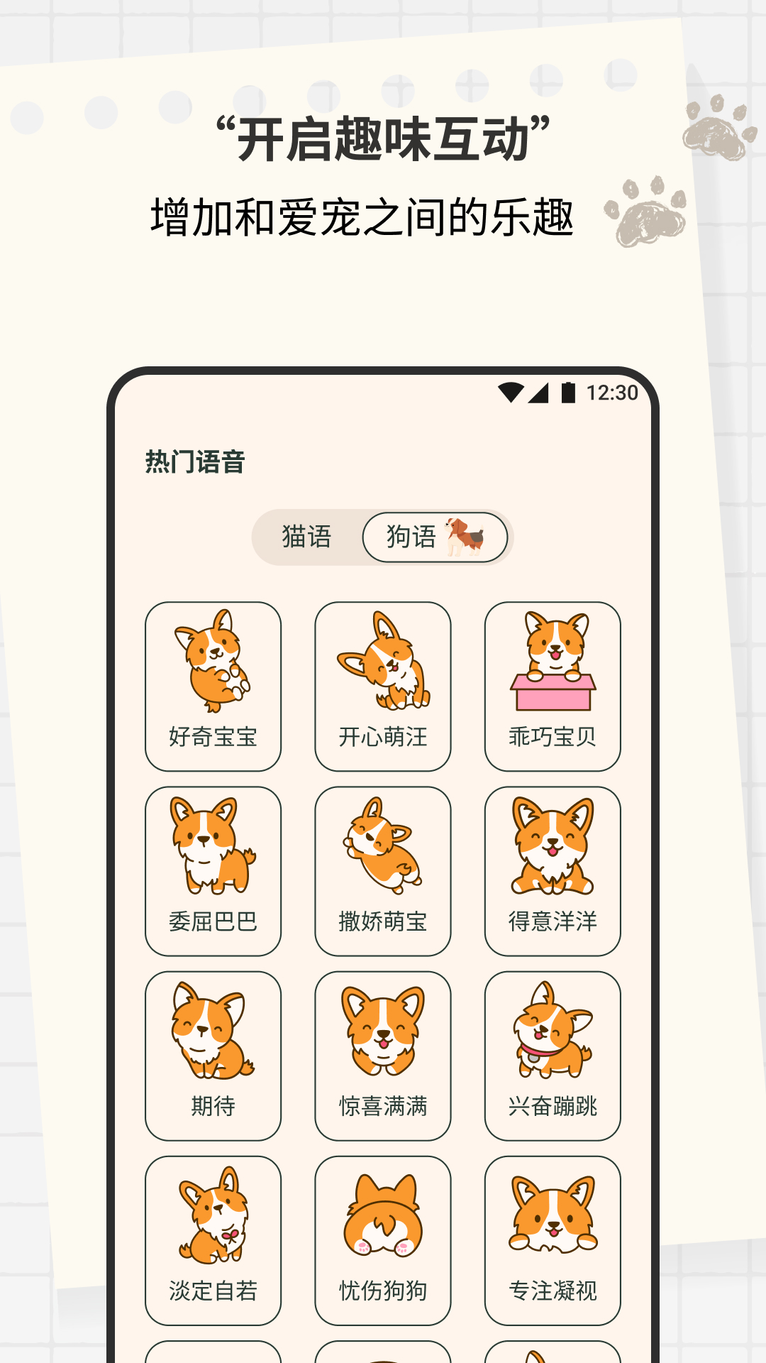 -支持猫咪、狗狗的语言翻译,并伴有各种场景的趣味音频,通过交流器更容易获得它们的注意力,让你们的日常互动更为顺畅;