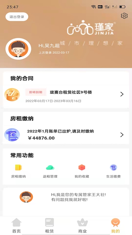 其五,个人中心功能完备,租户可在此查看签约合同、个人账单,还能了解收藏房屋的情况等,方便对自己的租赁事务进行管理。