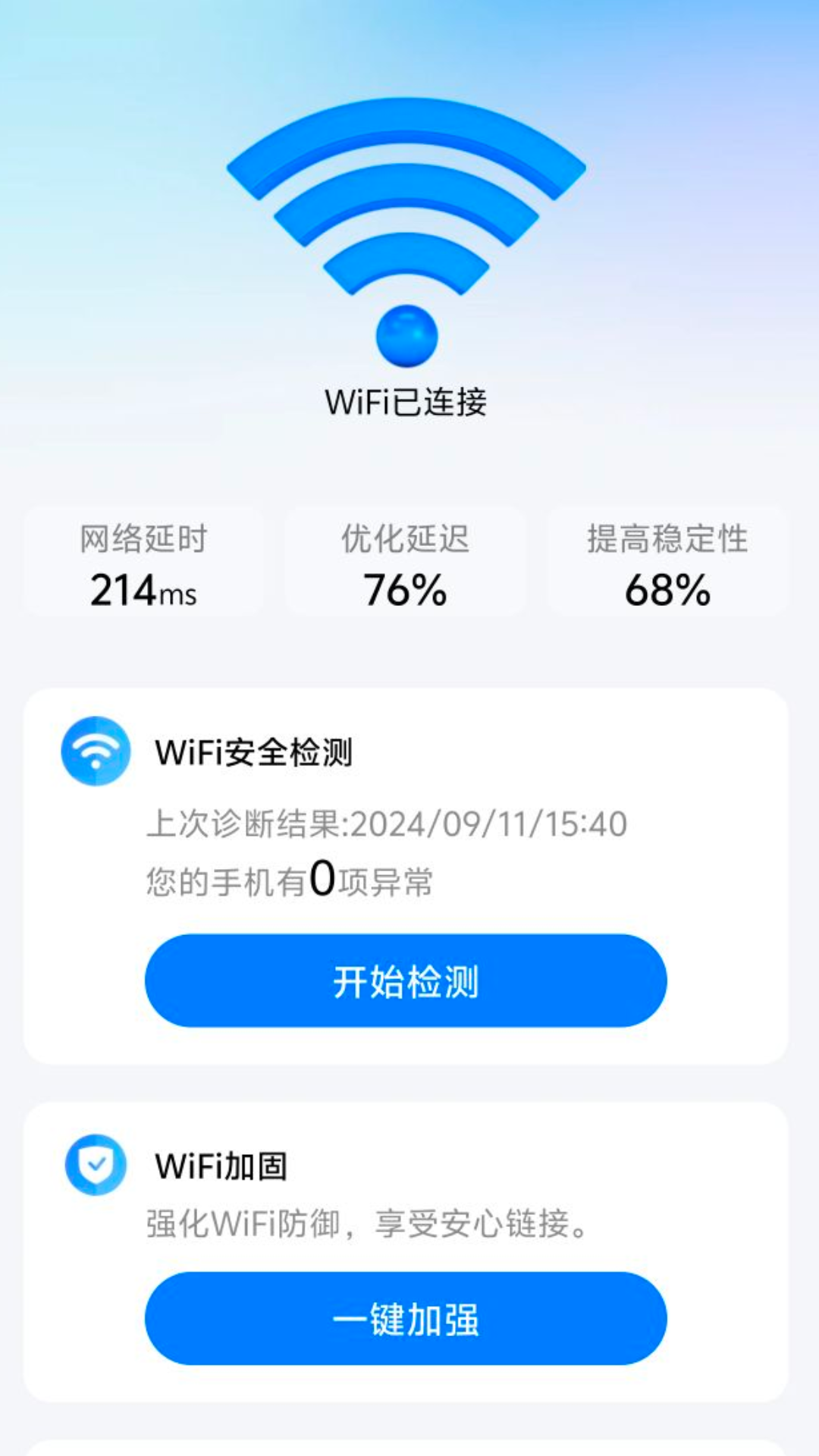 能够实时监测网络延时,对延迟进行优化,增强网络稳定性,保证您上网顺畅无阻。同时,还具备WiFi安全检测与加固功能,全力守护您的网络安全。