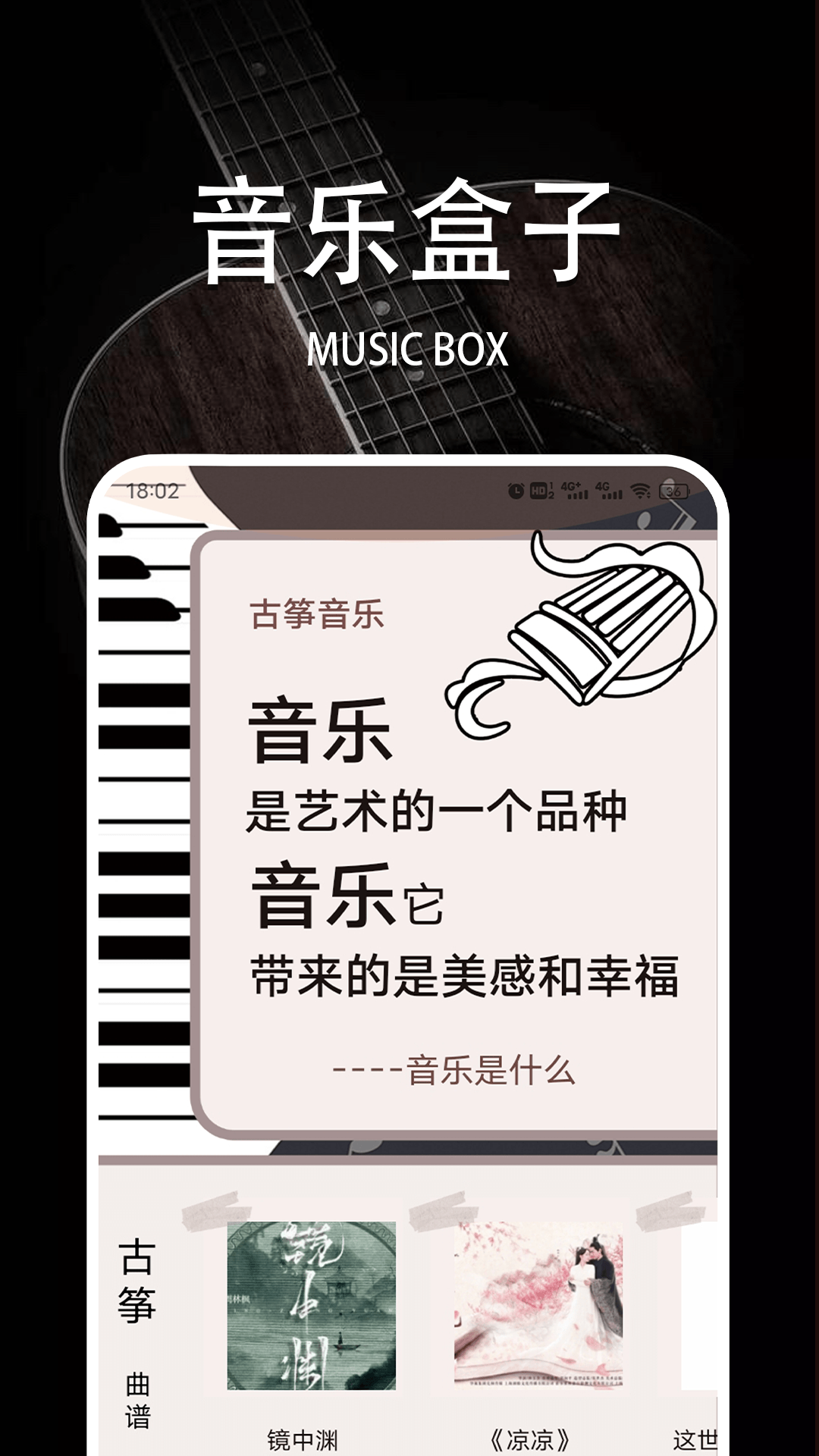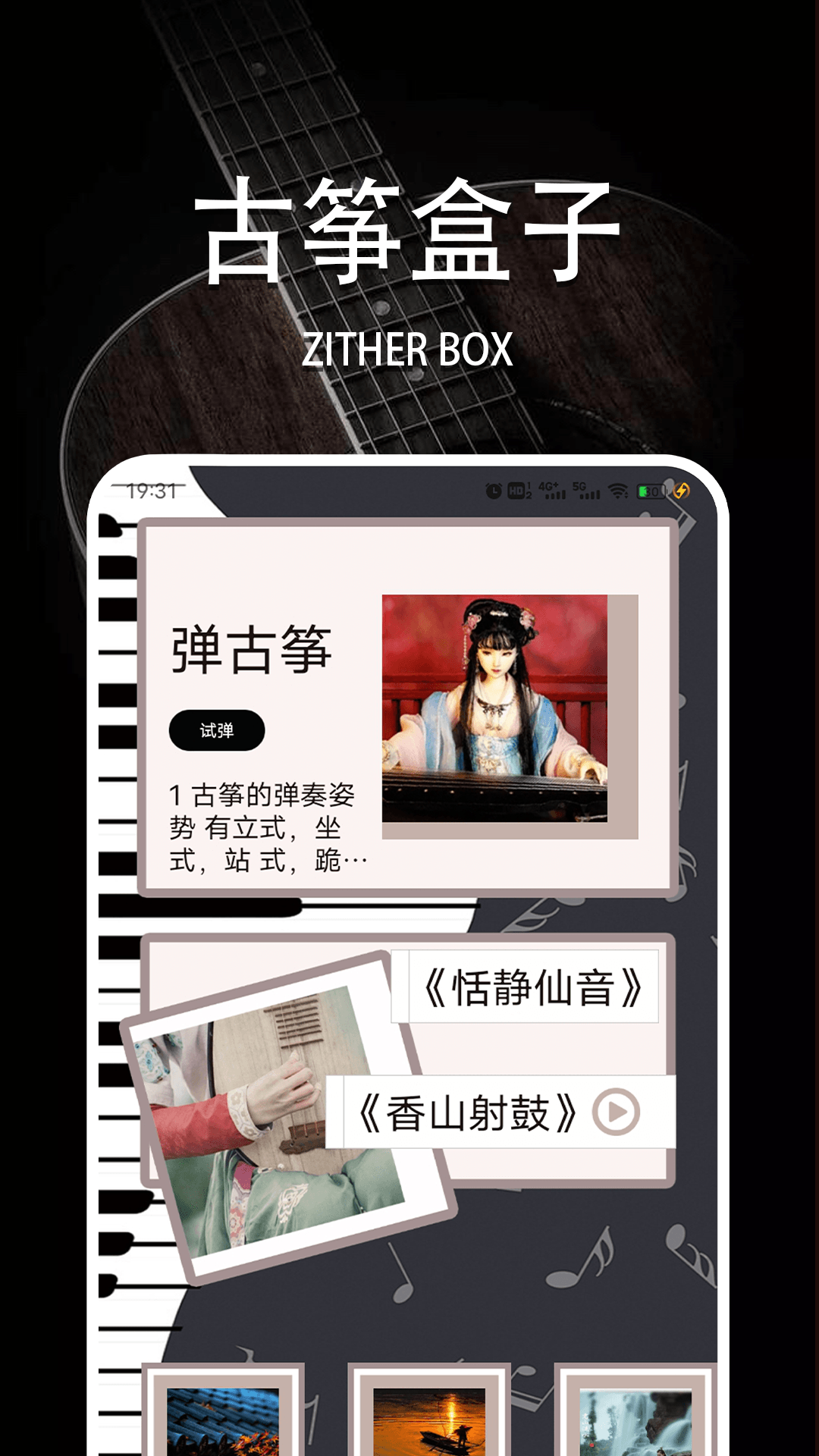 古筝,作为弹拨弦鸣乐器,它还有汉筝、秦筝这样的名字,是古老的汉民族乐器。其音域十分宽广,音色美妙动听,演奏技巧多样,表现力极强,所以有着“众乐之王”的美誉,也被叫做“东方钢琴”,是中国独特且非常重要的民族乐器。7k7k盒子是深受古筝爱好者喜爱的App,这里汇聚了大量古筝教学曲谱,快来下载体验吧!