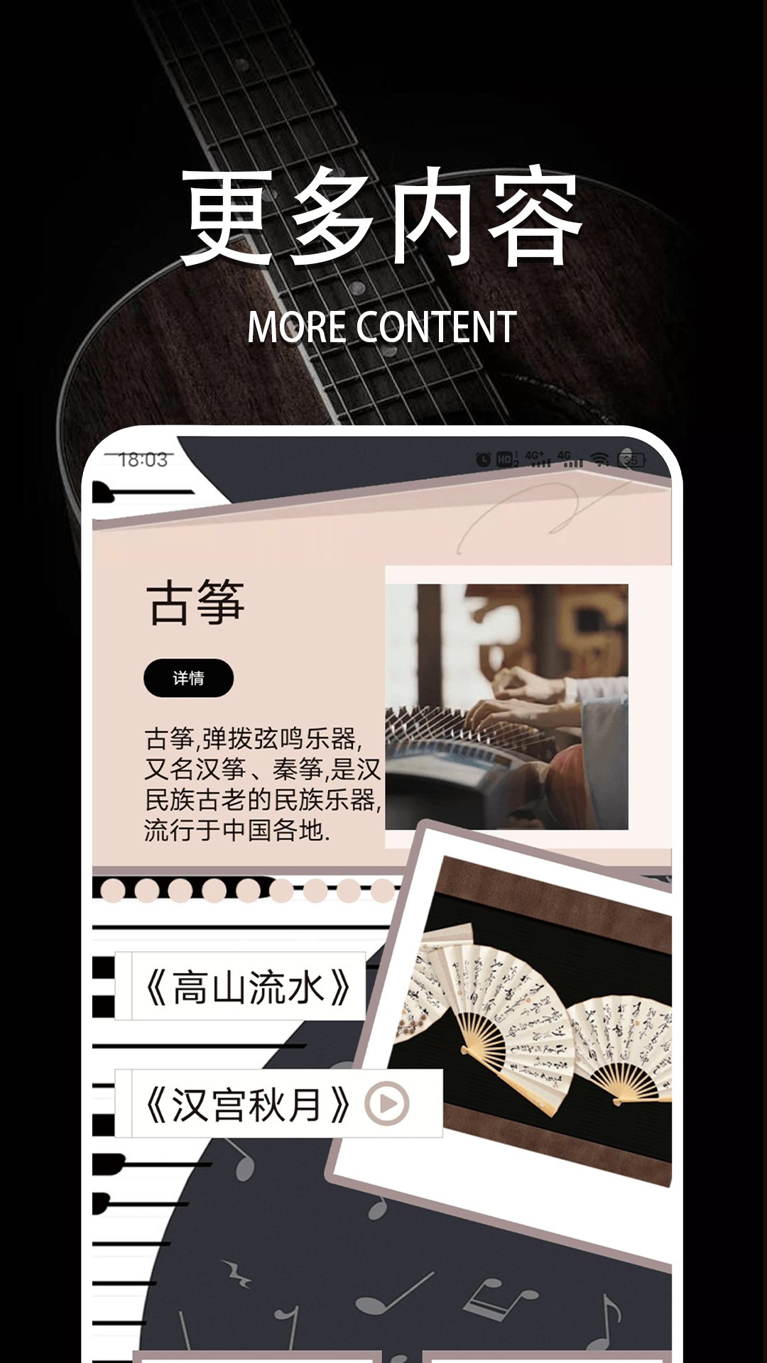 古筝属于弹拨弦鸣乐器,也被称为汉筝、秦筝,是汉民族古老的民族乐器。它音域宽阔,音色悦耳动听,演奏技巧丰富且表现力强大,由此被尊为“众乐之王”,也被称作“东方钢琴”,是中国重要且独具特色的民族乐器之一。7k7k盒子这个App深受古筝爱好者的喜爱,它汇集了众多古筝教学曲谱,赶快下载体验一下吧!