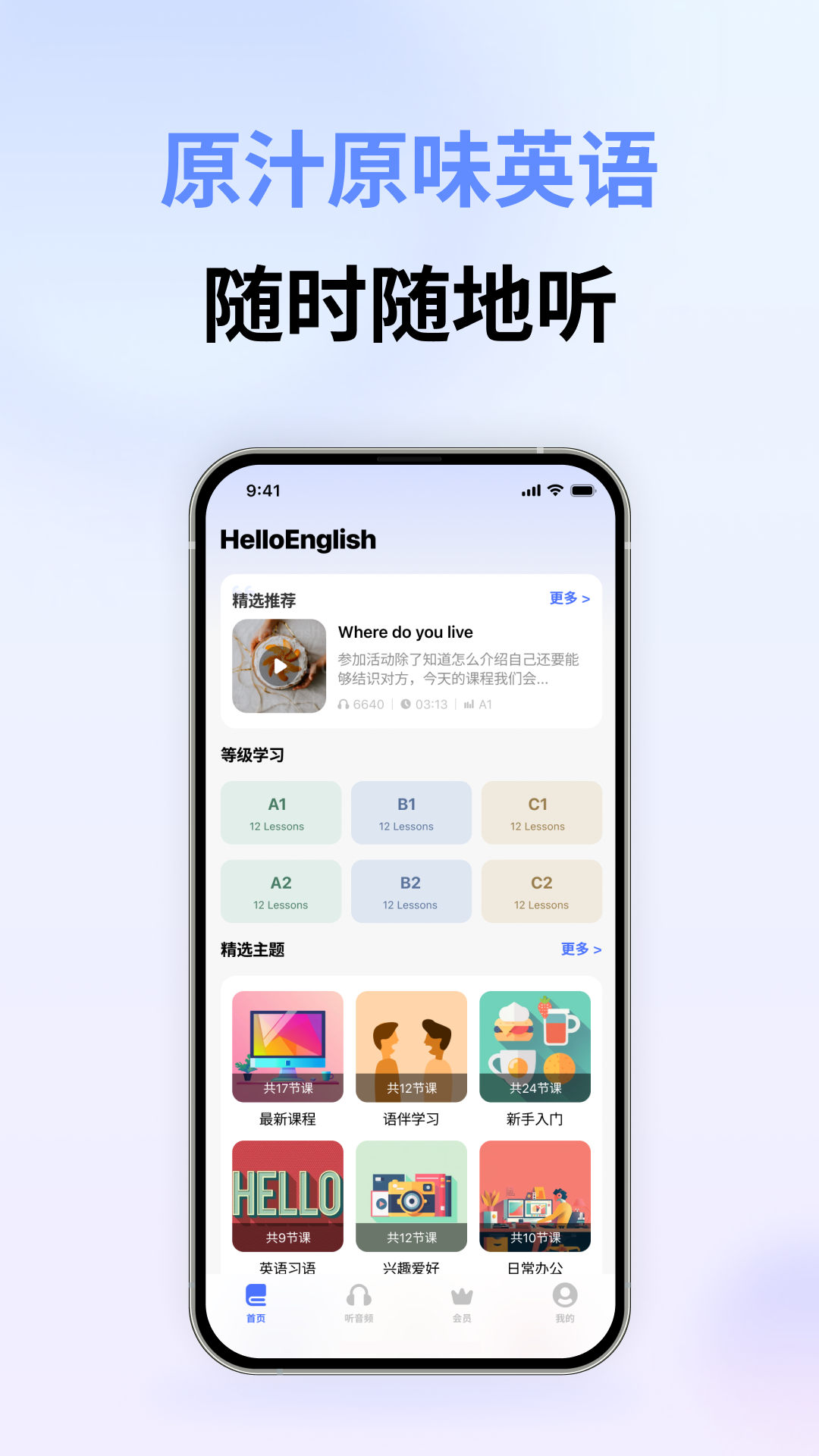 HelloEnglish APP 是一款随听随学英语知识的应用软件,它以情景学习理论为基础,覆盖了各种主题和生活场景,为你提供实用有趣、原汁原味的英文地道表达内容。你可以从中学习到 1500 多个词汇,以及 2800 多个常用语法知识点和经典例句。
