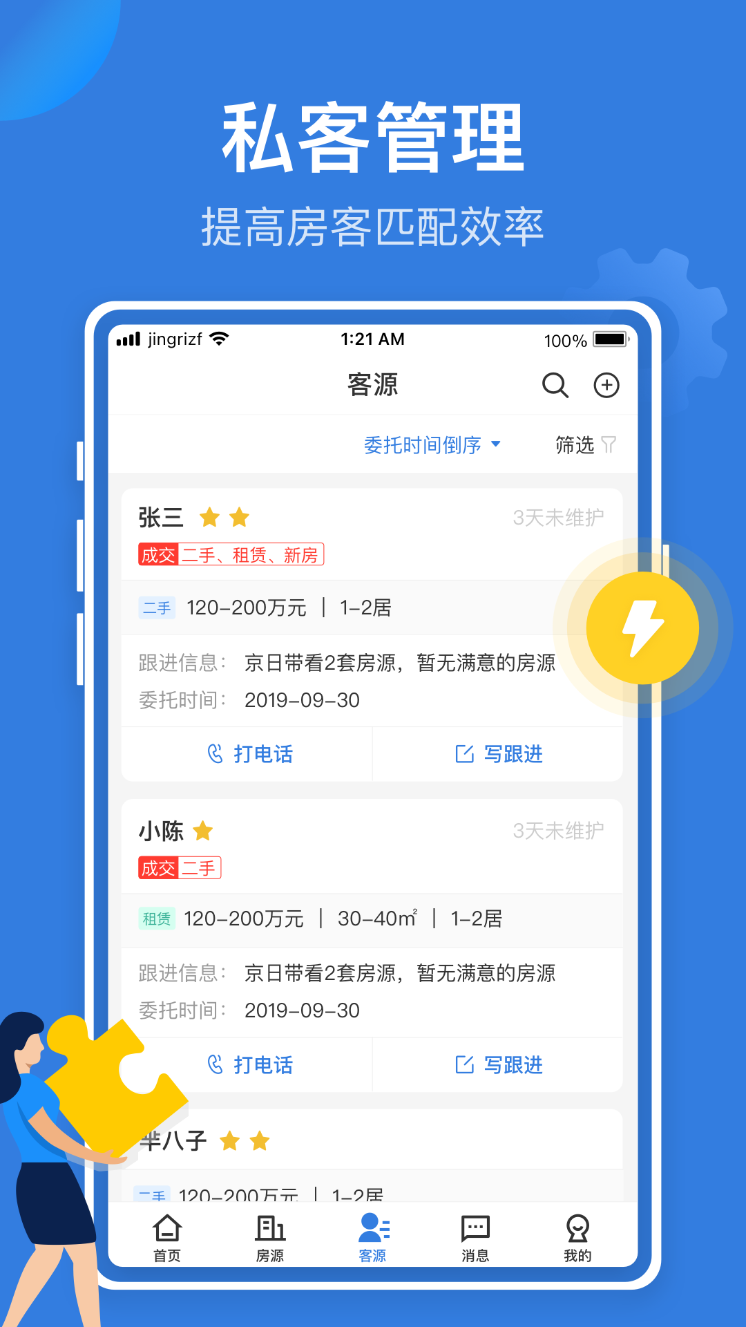 京日管家平台具有诸多实用功能,它支持【录跟进、楼盘作业】等实时操作。作为经纪人的得力房客管理工具,京日管家能够实时对房客信息进行跟进,精准地捕捉到房客最新的动态情况。同时,该平台还可以精准地展示经纪人的业绩,清晰地反馈经纪人的经营状况。