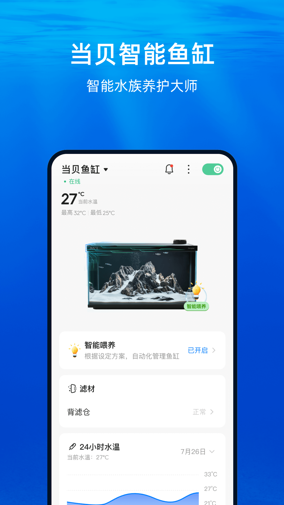 当贝+ App 需要配合「当贝智能鱼缸」硬件设备一起使用,是一款支持对当贝智能鱼缸实现智能水质监测、自动喂食、灯光调节等智能控制的应用软件。