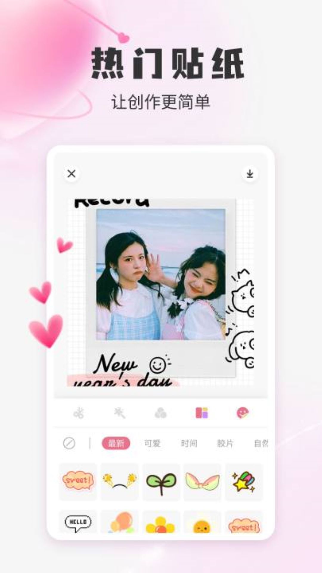 主要功能有美颜拍摄,海量风格滤镜,拼图,超多可爱贴纸,摄影秘籍干货满满。
