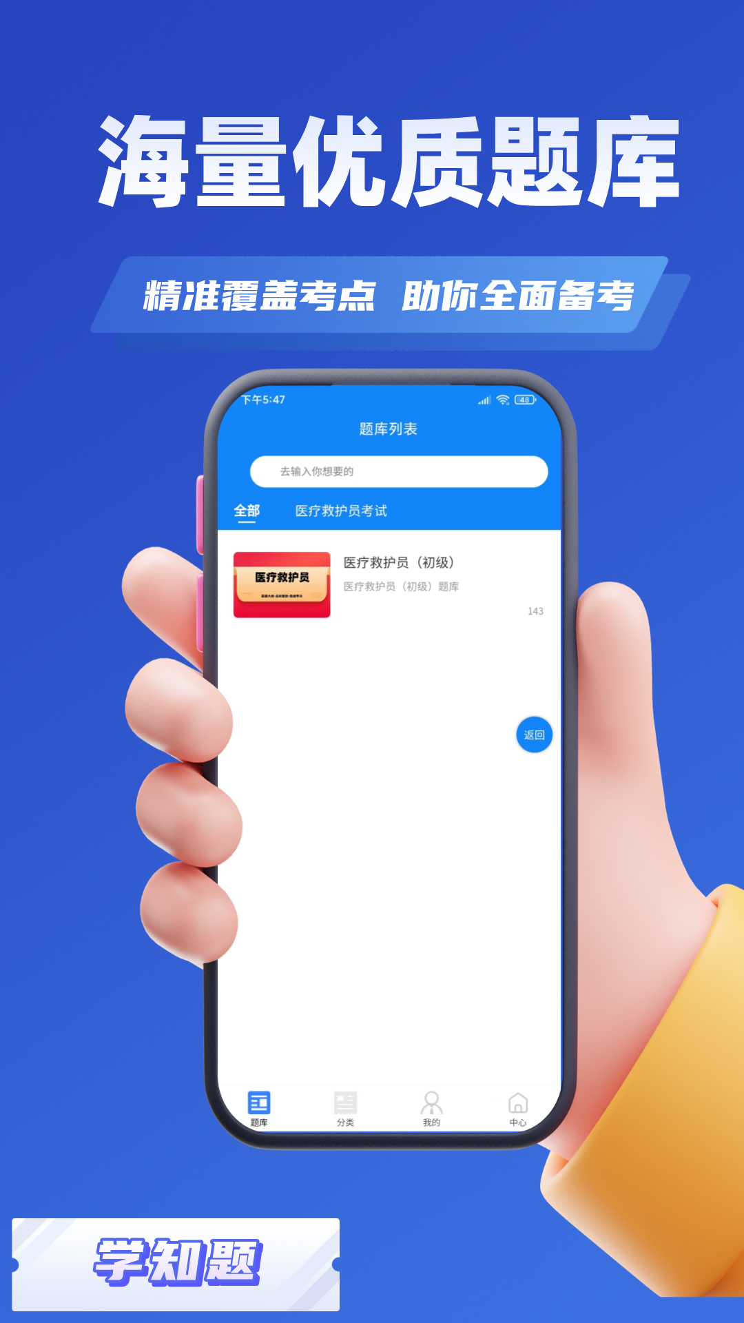 【医疗救护员考试学知题】包含医疗救护员考试的所有知识点,涵盖模拟考场、快速练习、考点练习、测试纪录、错题重做等功能模块,学员通过模拟练习来判断自己缺失的知识点和薄弱环节,通过错题重做功能,来补足学员短板,助力考试通关! 我们的题库包含了医疗救护员考试的高质量试题(含历年真题),都可以在线做题、交卷、评分等,并支持章节练习,错题重做等特色功能。