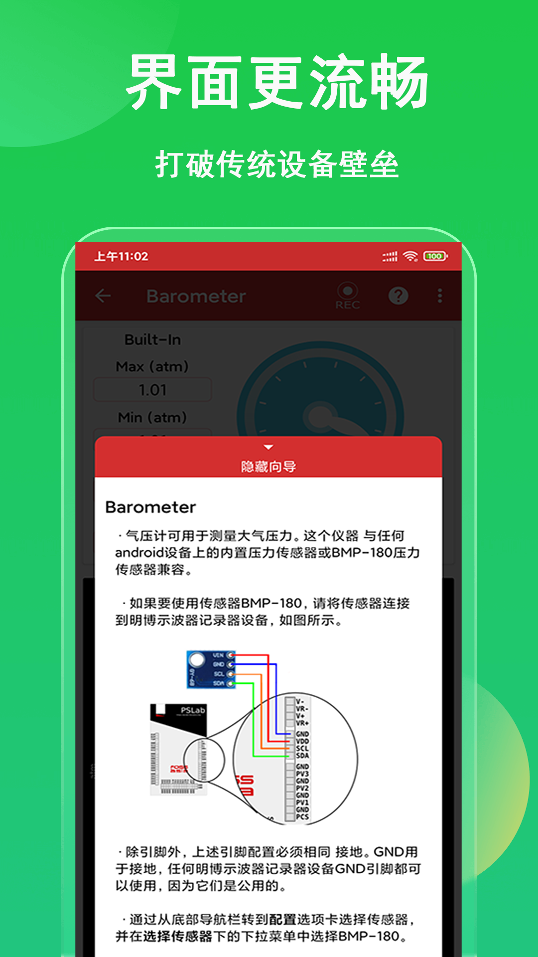 您可以使用Luxmeter(光度计)、气压计等仪器进行测量,也能够直接运用手机传感器开展测量。其他仪器可借助硬件扩展(将多个设备组合起来的扩展方式)来使用。