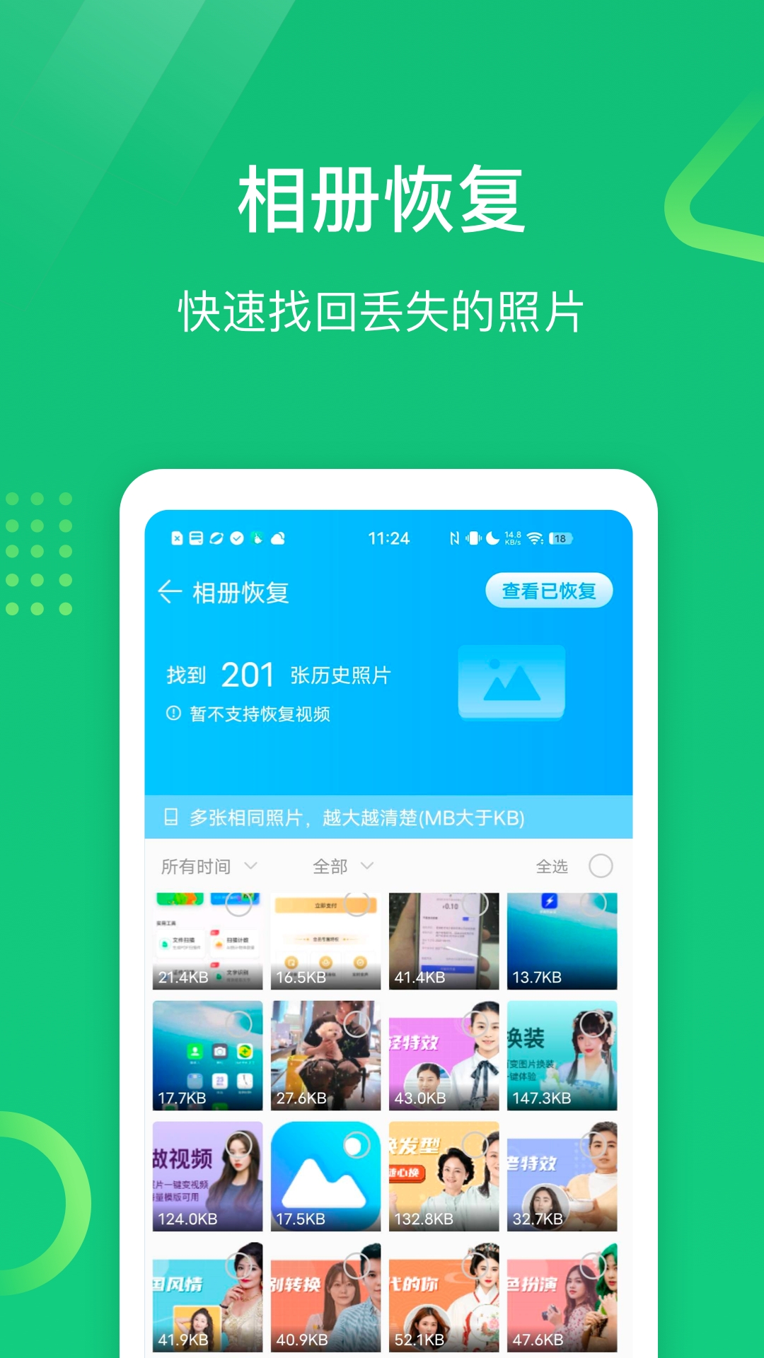 【一键恢复丢失照片】找不到历史上已经删除的照片?它可以智能扫描手机文件,深入查找已丢失的图片,只需一键就能恢复图片内容。