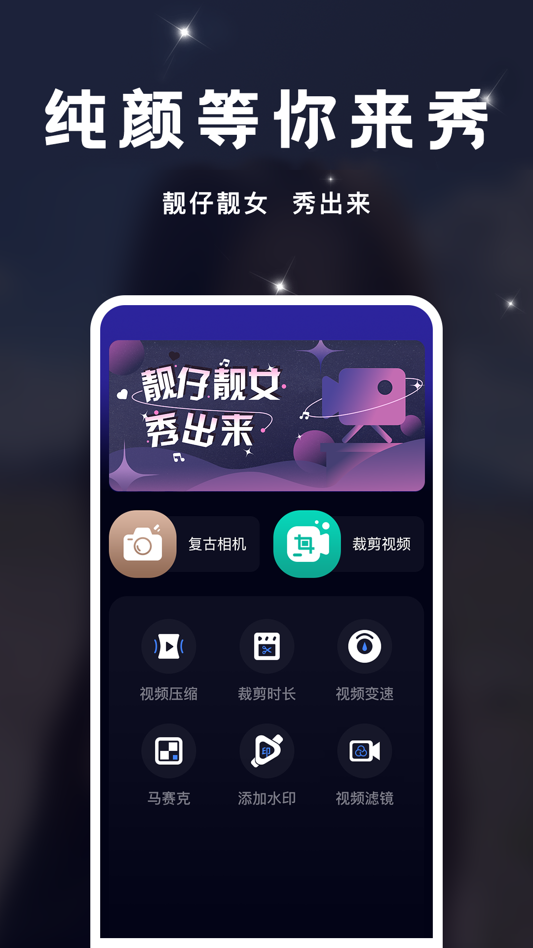 纯颜,视频编辑小工具,秀出你超靓的短视频,我们有以下功能供您选择: 1.复古相机:让你回到20年前的手机拍照摄影时代 2.视频去水印:指定视频位置,快速去除水印 3.视频添加水印:在视频任意部位添加自定义水印 4.视频裁剪尺寸:剪掉视频不需要的部分,随心所欲,裁剪视频尺寸 5.视频裁剪时长:准确裁剪视频长短,裁出你要的精彩片段 6.视频压缩:一键压缩,视频缩小好几倍呢,更省手机空间 7.视频变速:调节视频的播放速度 8.视频滤镜:超多精美滤镜等您发现 使用中遇到任何问题可在APP里咨询客服,我们期待您的建议和反馈!