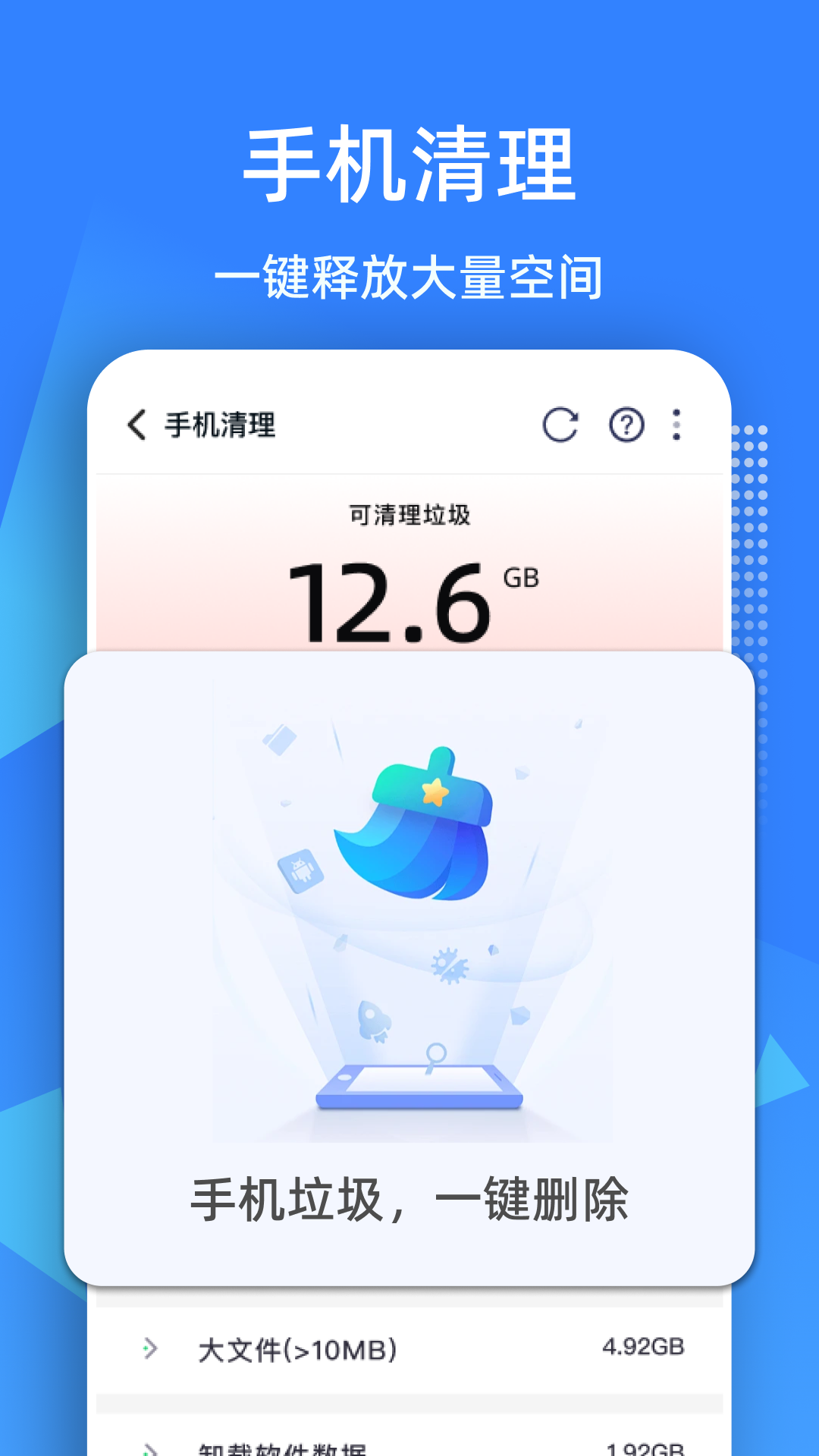 快速清理绿色版是一款专注手机垃圾清理,内存释放,手机运行加速的专业手机清理软件,我们可以有效解决手机使用过程中的一切卡顿、耗电、内存不足等问题,做你的贴心手机垃圾清理大师。