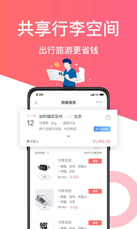 在游箱上,出行人的每一个行程都有价值。出行人可以选择更方便、更喜欢的寄件请求。订单完成后,出行人可对寄件人进行评价。游箱希望遇到热爱生活,热爱分享的你。