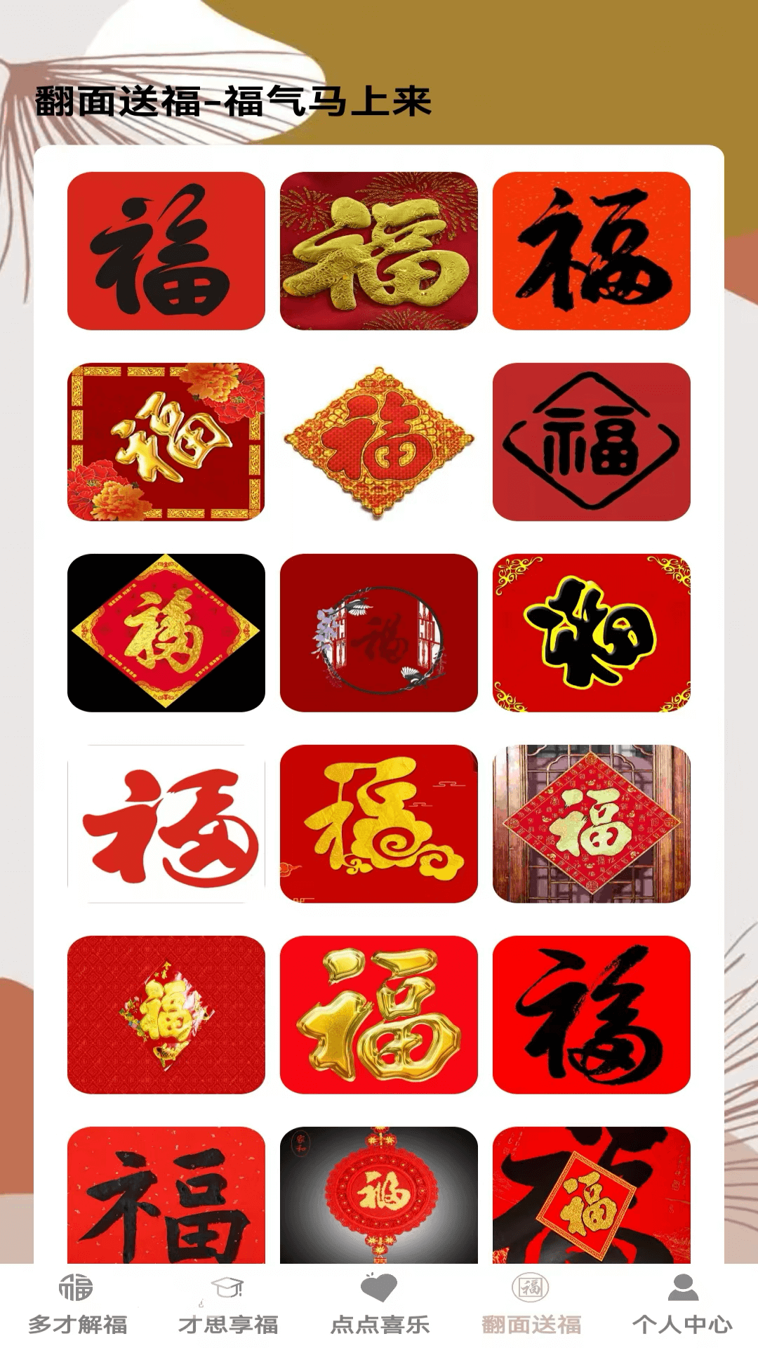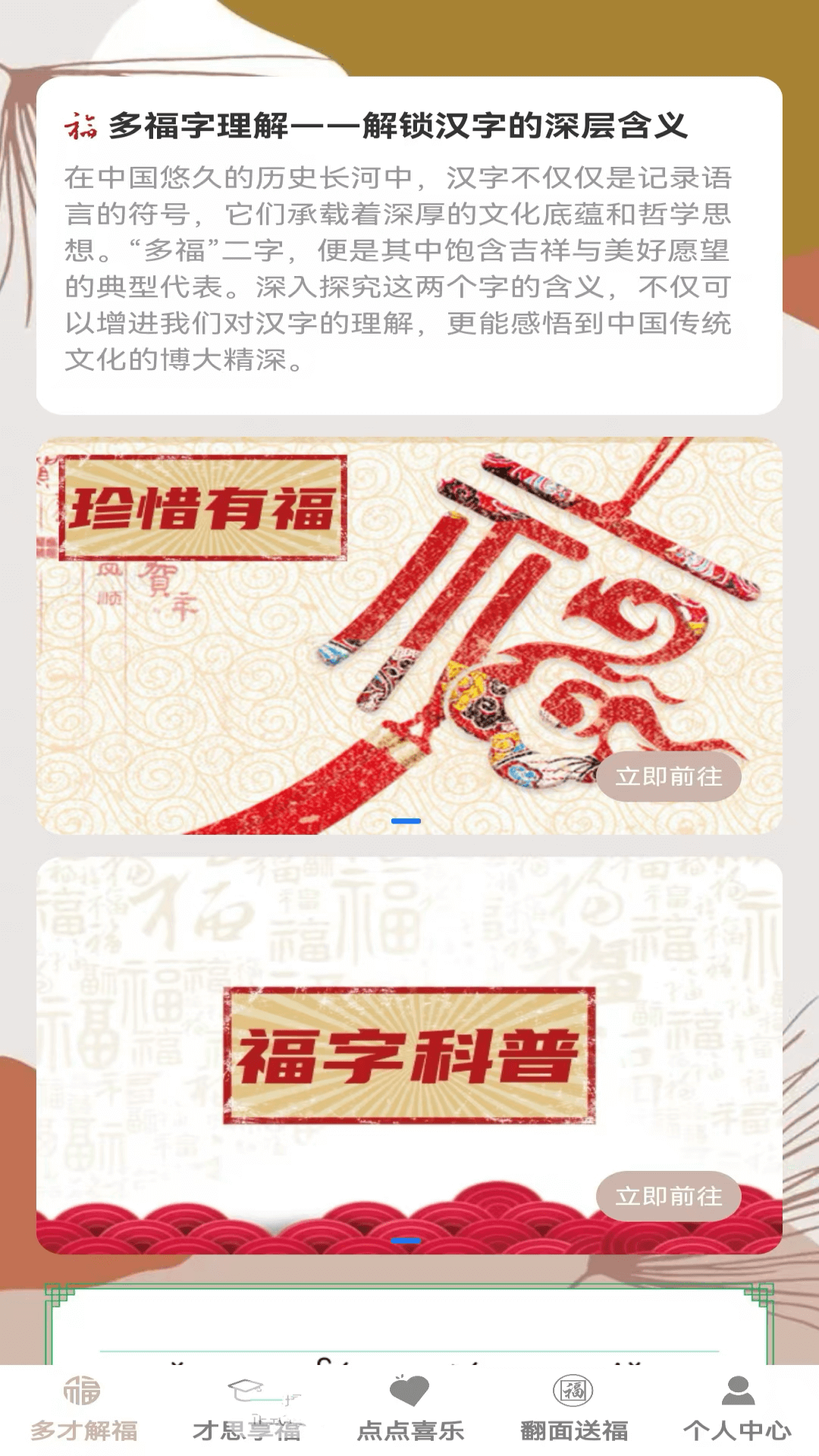 在这个节奏飞快的时代,【多才多福】APP全心全意为您打造知识与乐趣并存的体验。在我们的平台上,您能够轻松地探寻“福”字历经千年的传承脉络,无论是它的起源故事,还是现代所蕴含的寓意;不管是科普文章,还是实用的幸福生活指南,各个板块的科普内容都会让每一份福气变得近在咫尺。