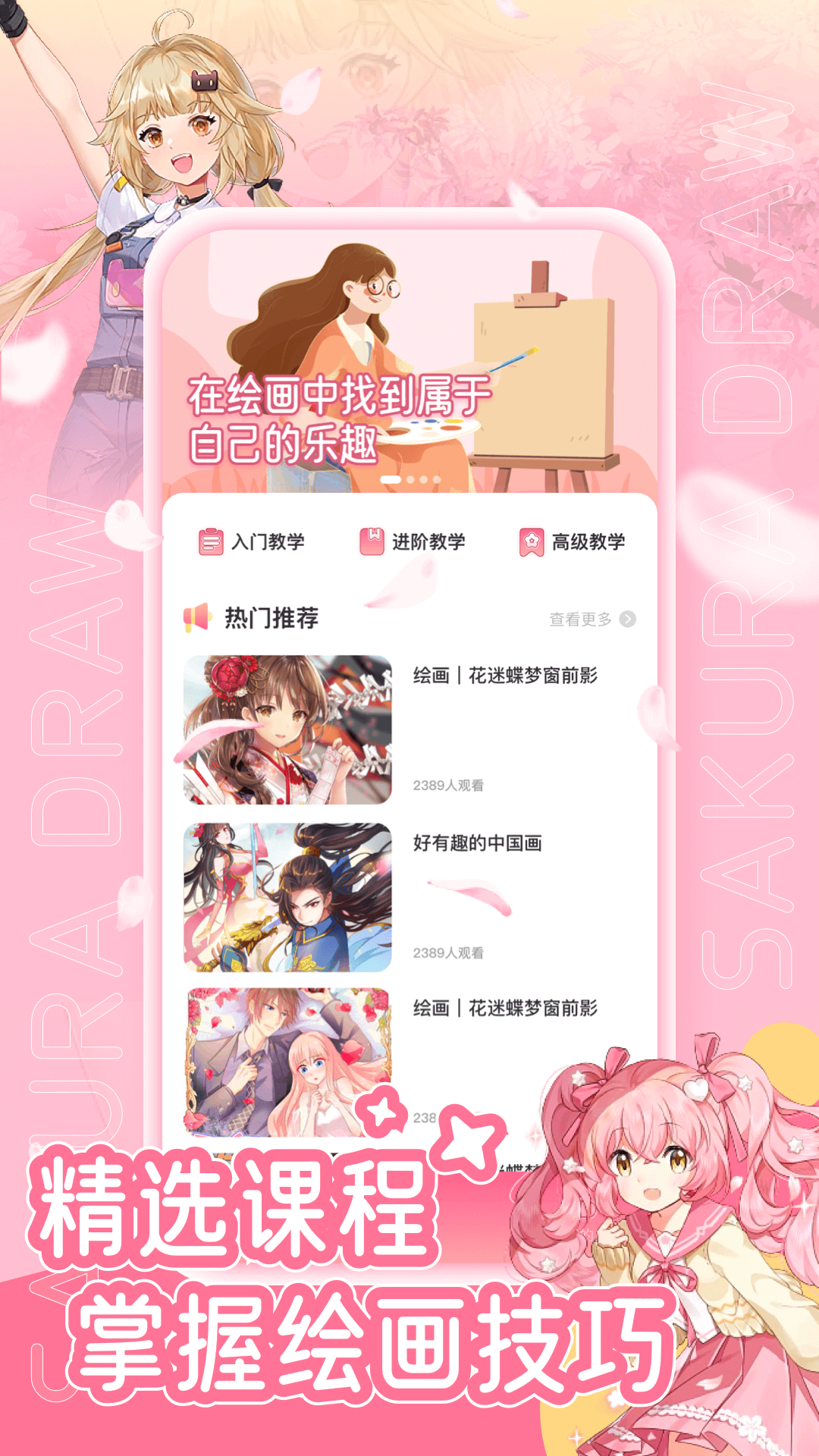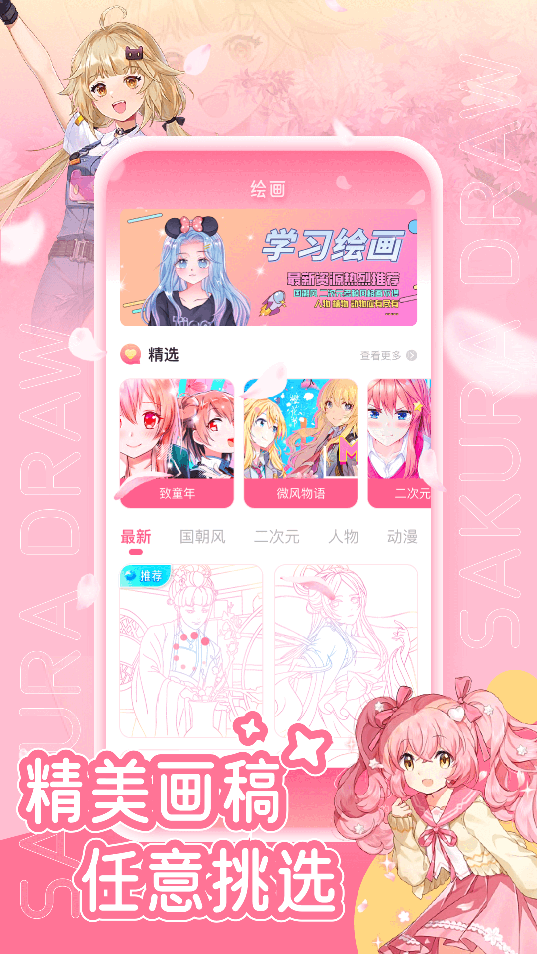 樱花动漫填色是专门为广大动漫爱好者打造的一款app。它包含了各种各样类型的动漫内容,除此之外,它还有超有趣的动漫填色板块以及绘画课堂等特色功能,快来加入体验吧!