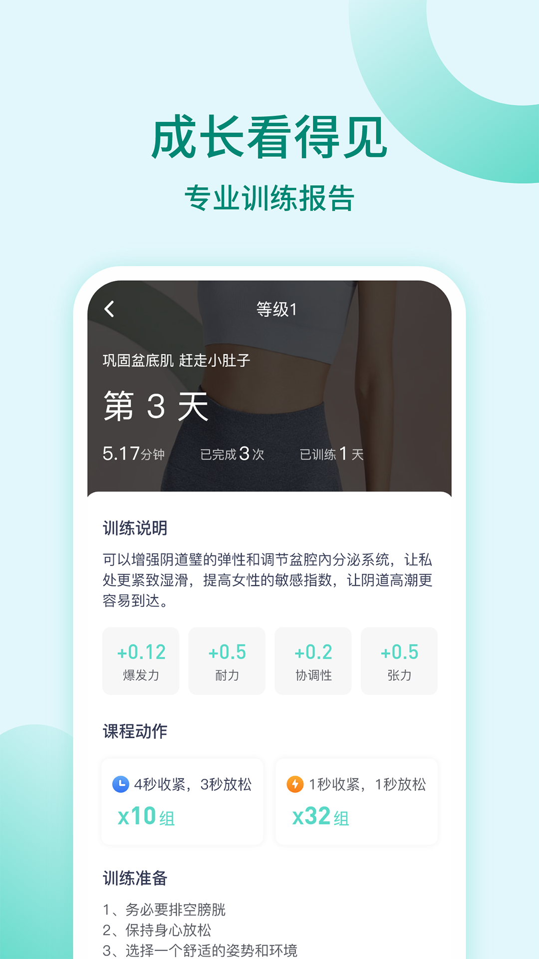 凯格尔训练是一款专业的健身App,它专注于为用户提供盆底肌锻炼方面的指导,让使用者能够不受时间和地点的限制,随时随地开启健身锻炼课程。