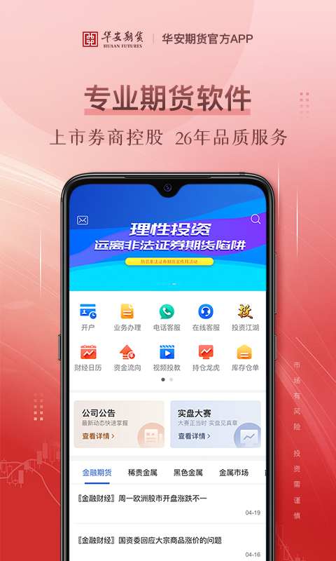华安期货APP是一款功能全面的期货开户交易软件,涵盖了商品、农产品、工业品、股指、国债、期权、黄金、白银、原油、贵金属等众多品种相关的功能,集期货开户、期货交易、期货行情展示、期货资讯提供、业务办理以及在线客服等功能于一身,是您进行金融理财的便捷选择。