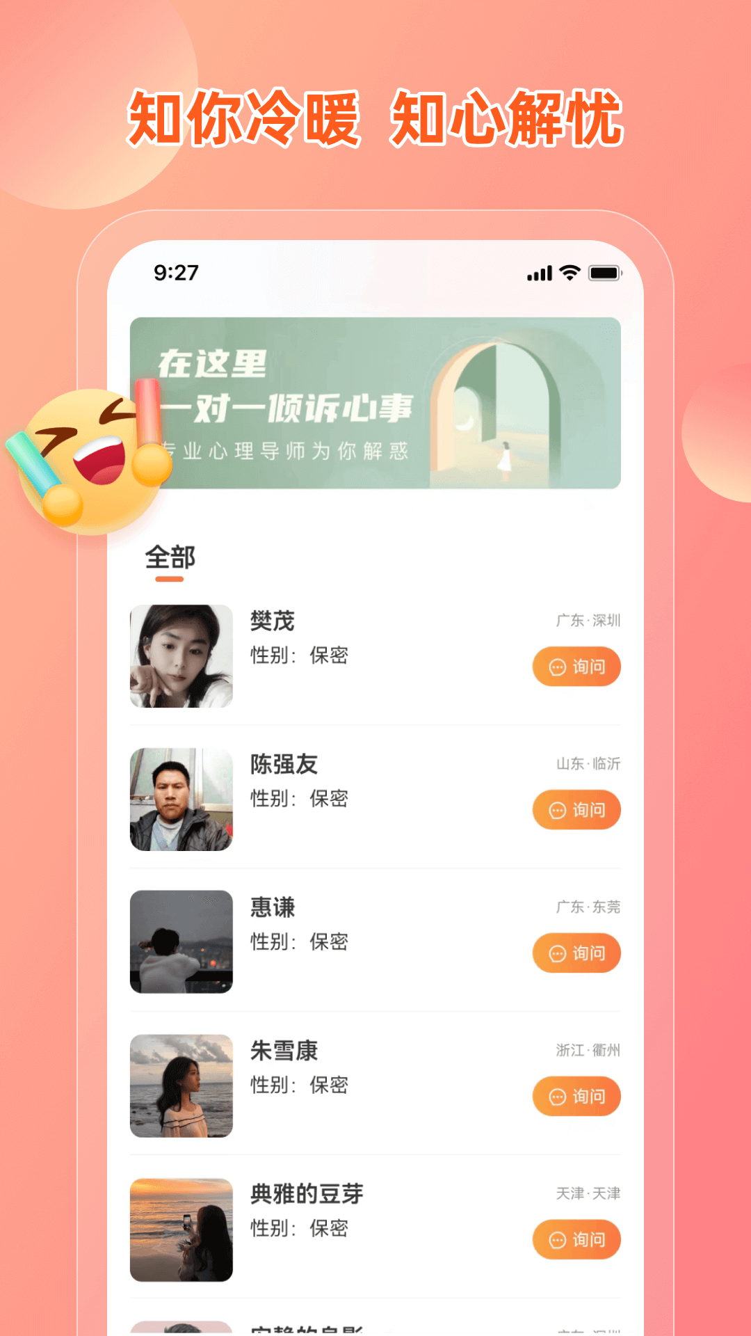 产品特点: 【无需预约】咨询师24小时在线,随时随地即时交流。 【匿名保护】用户可以匿名咨询,全面保护用户的个人隐私。 【资质认证】专业的心理咨询面试官会对每一位咨询师进行严格的面试和笔试,通过两轮面试的咨询师才能入驻平台,咨询有保障。